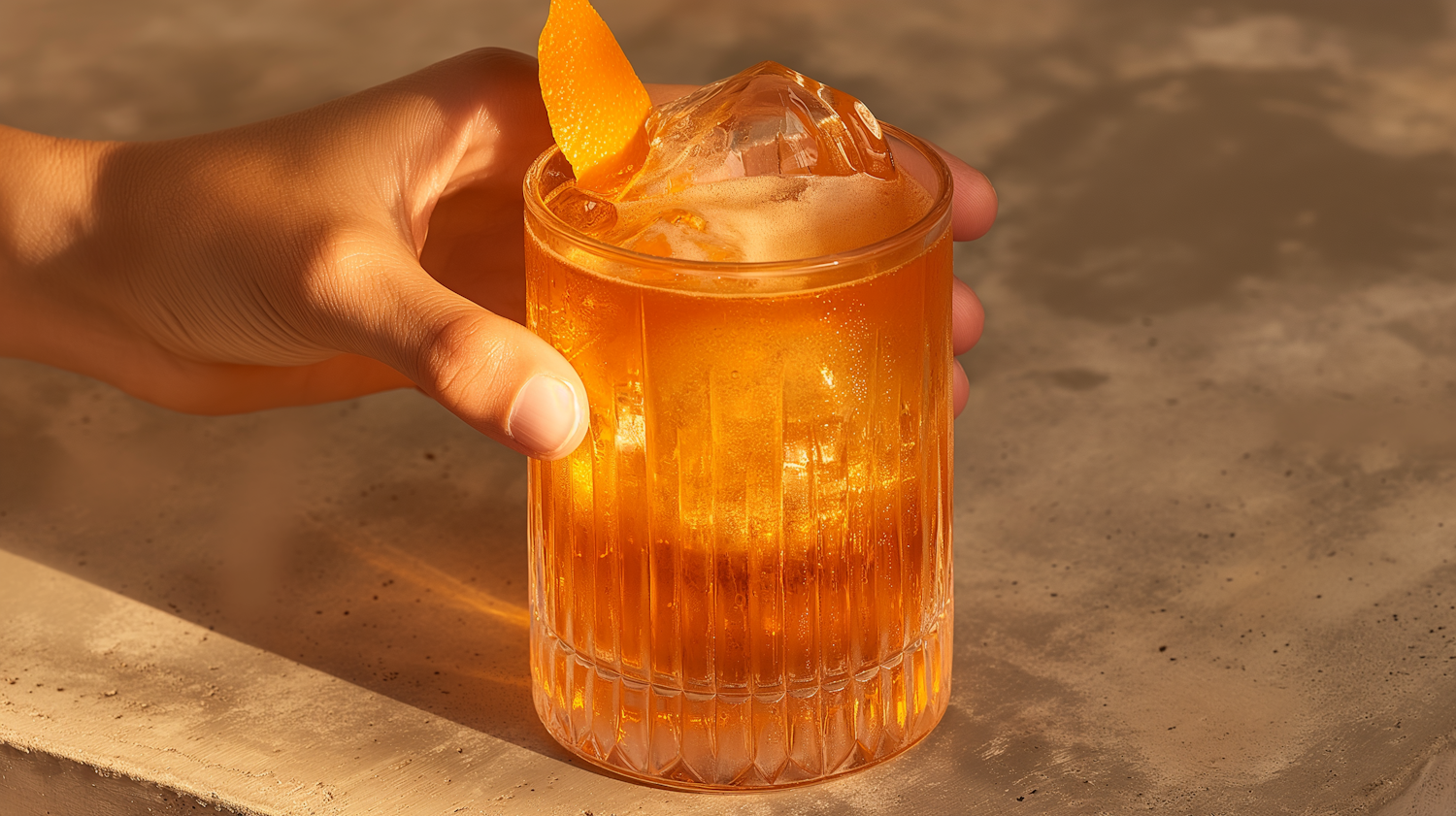 Hand holding a textured glass with an orange cocktail, ice cube, and orange peel garnish on a stone surface.