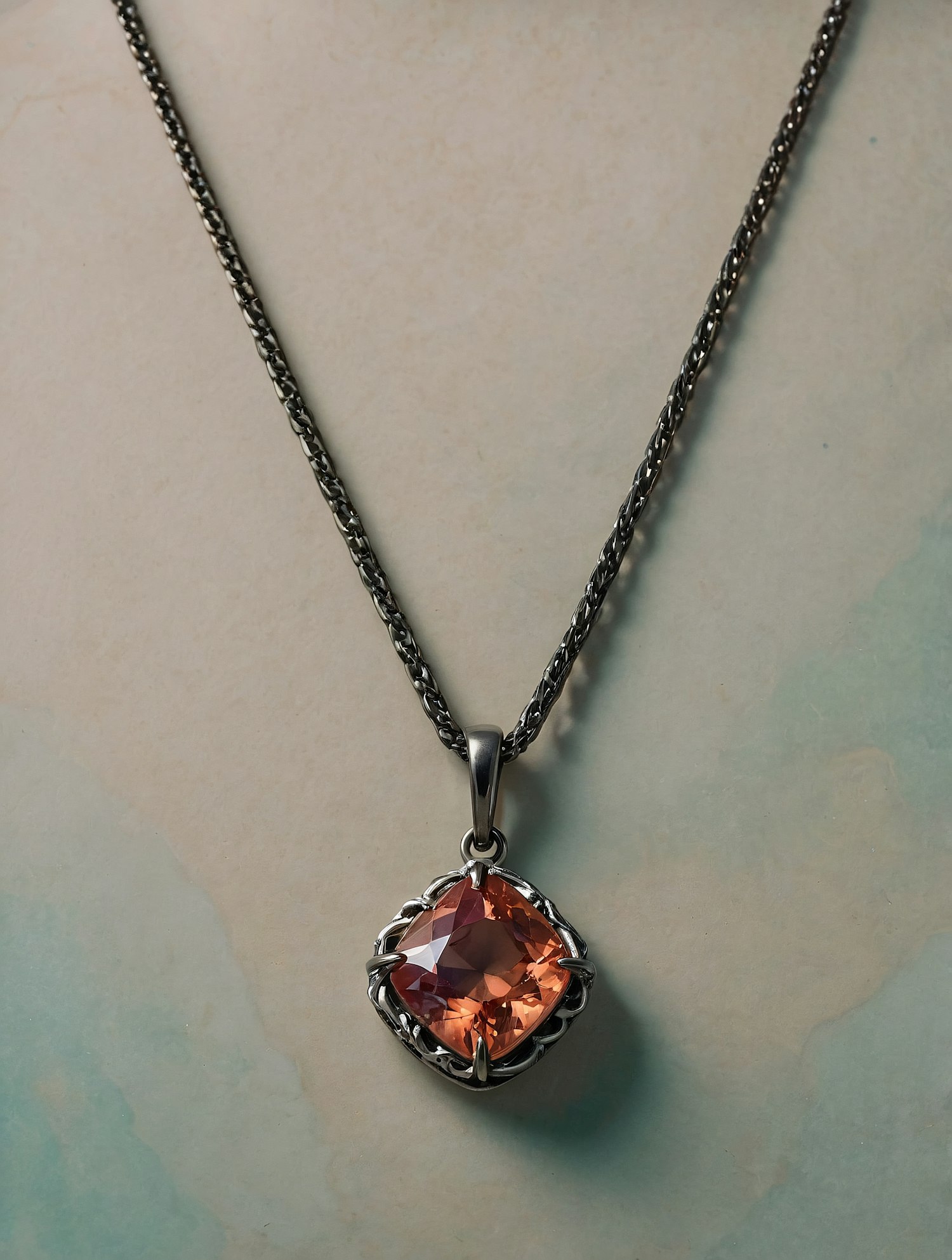 Elegant necklace with a dark chain and a square-cut orange gemstone pendant in a silver setting, on a soft beige and green background.