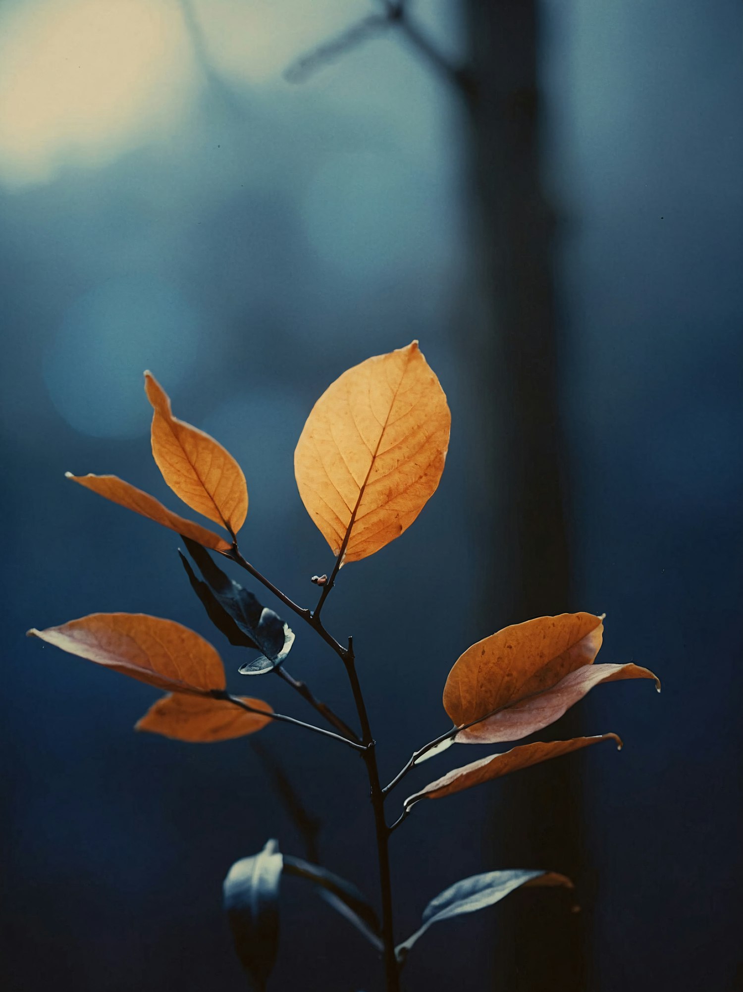 Vibrant orange leaves on a branch against a serene blue background, creating a tranquil and elegant composition.