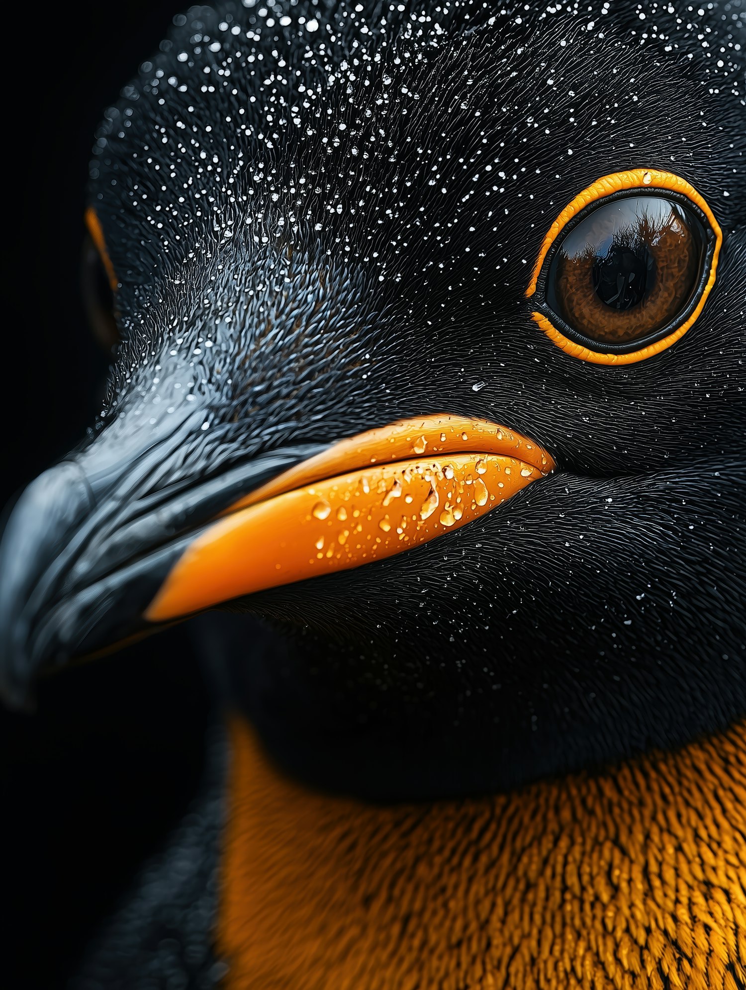Close-up of a penguin's face with water droplets on its sleek black feathers and vibrant orange beak and eye ring.