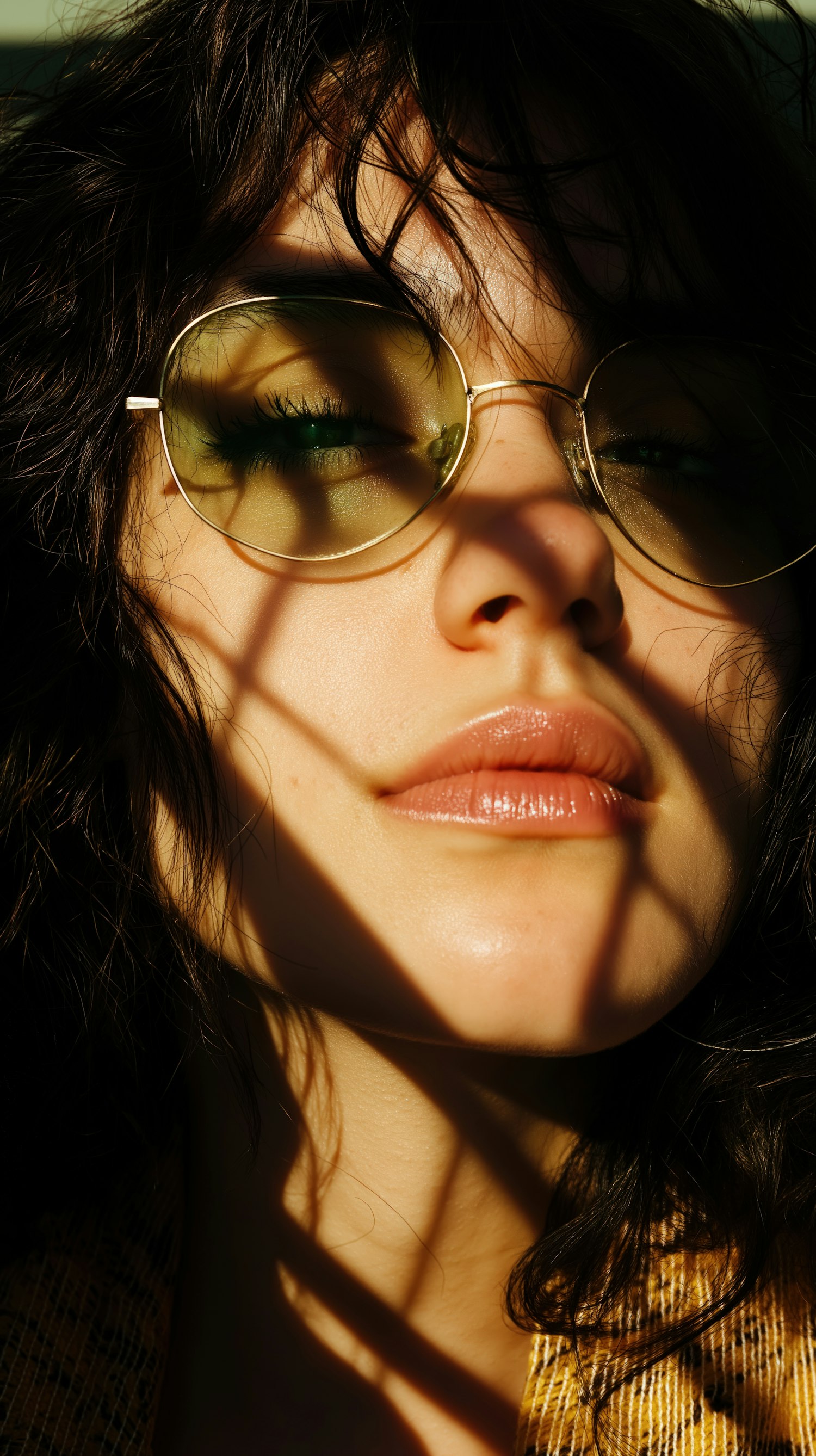 Close-up of a woman with sunglasses, dramatic shadows, and sunlight highlighting her features.