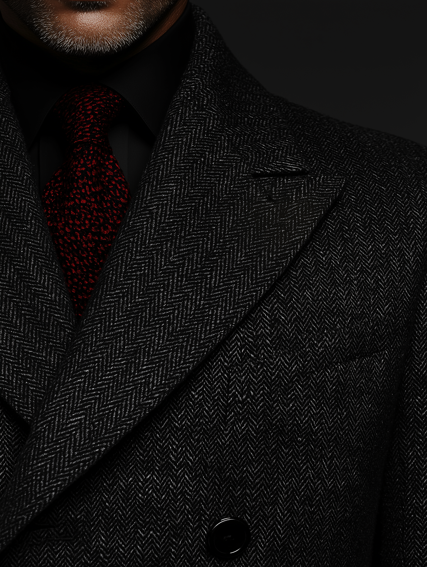 Close-up of a stylish herringbone overcoat with a red tie, black shirt, and salt-and-pepper beard for a sophisticated look.