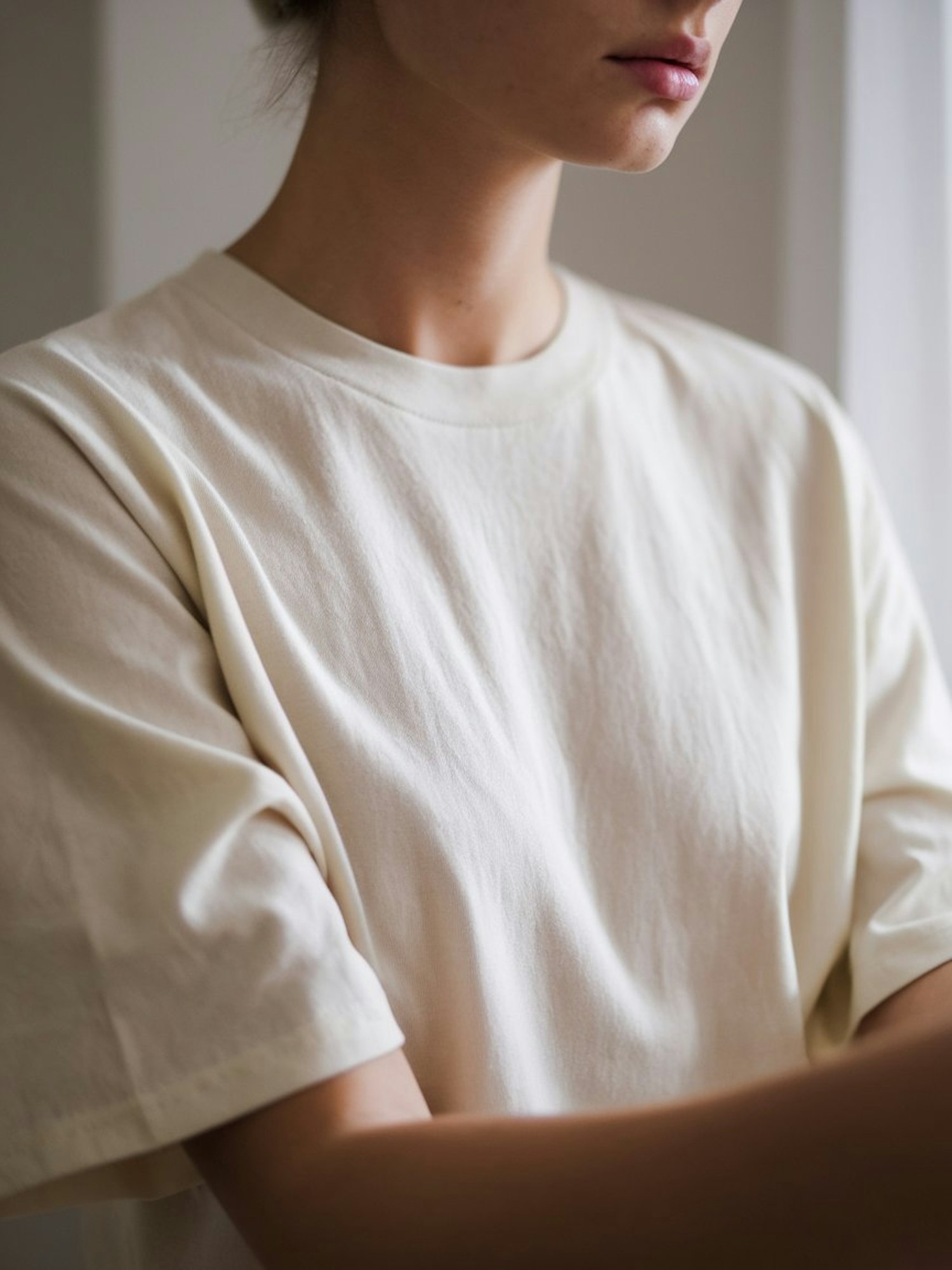 Close-up of a person in a light T-shirt, focusing on the upper torso and neck, with a serene indoor setting.