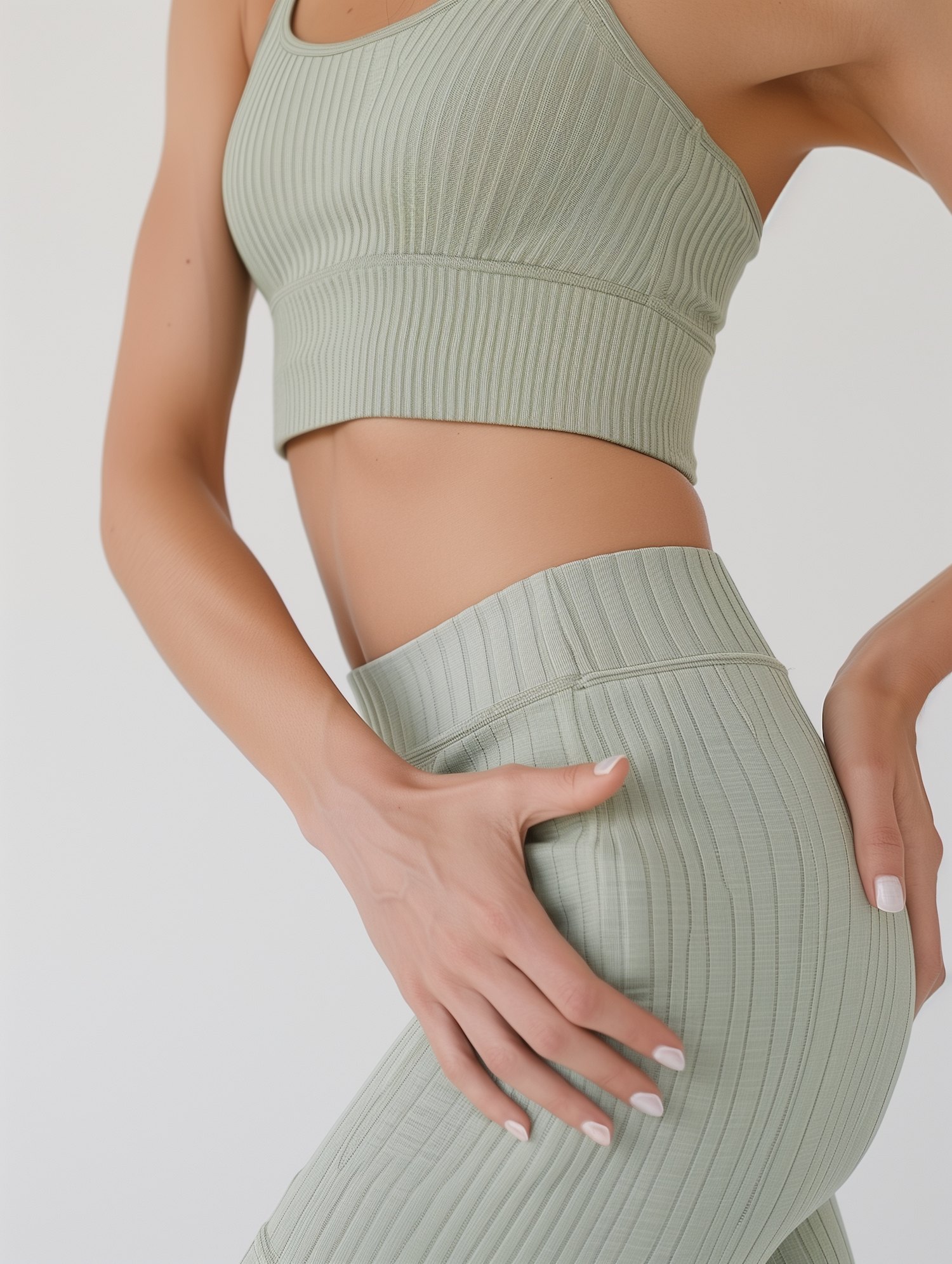 Close-up of a person in a ribbed sage green workout set, showcasing a toned physique and stylish activewear.