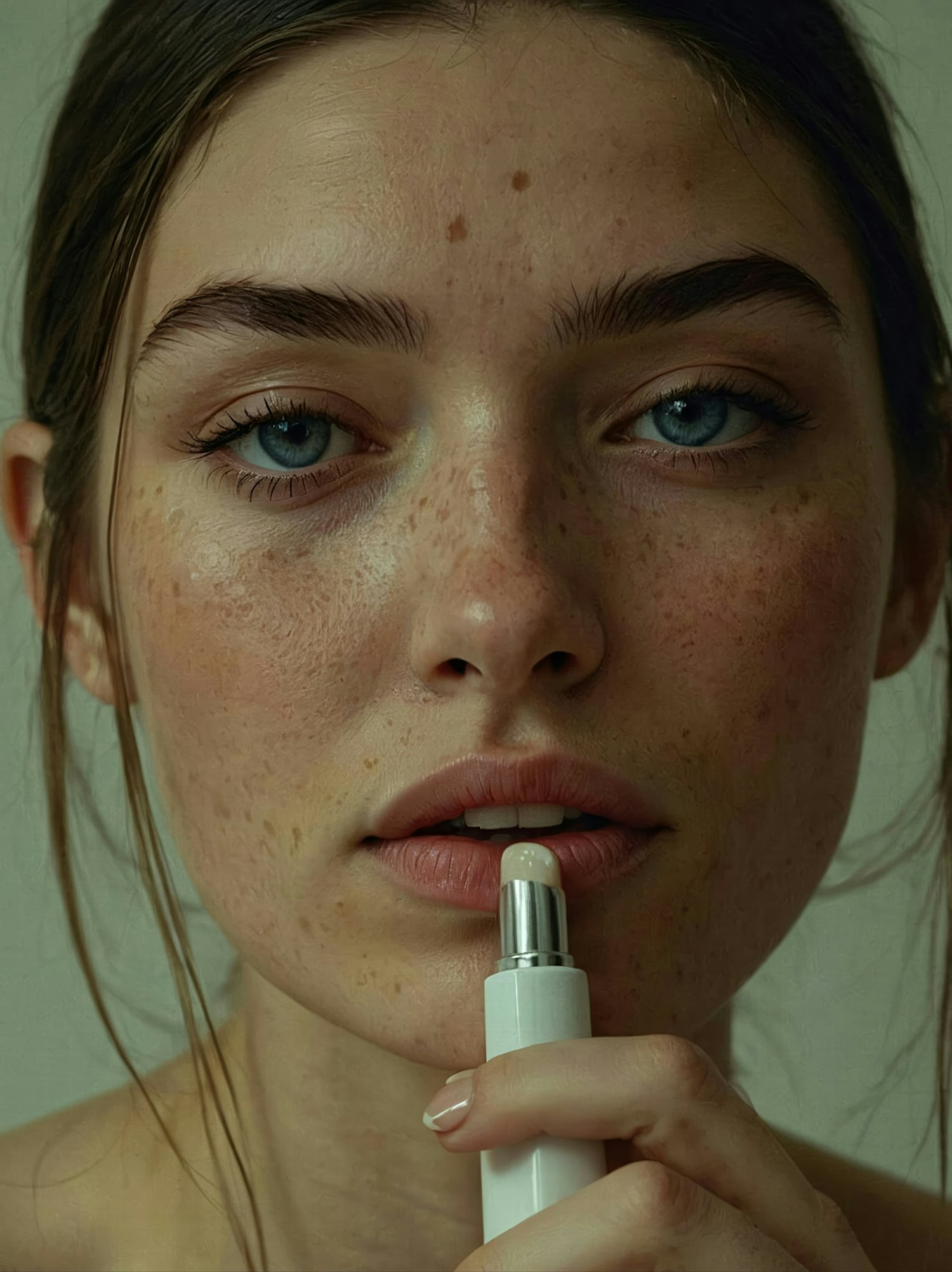 Close-up of a freckled woman with blue eyes applying lip balm, highlighting natural beauty and skincare.