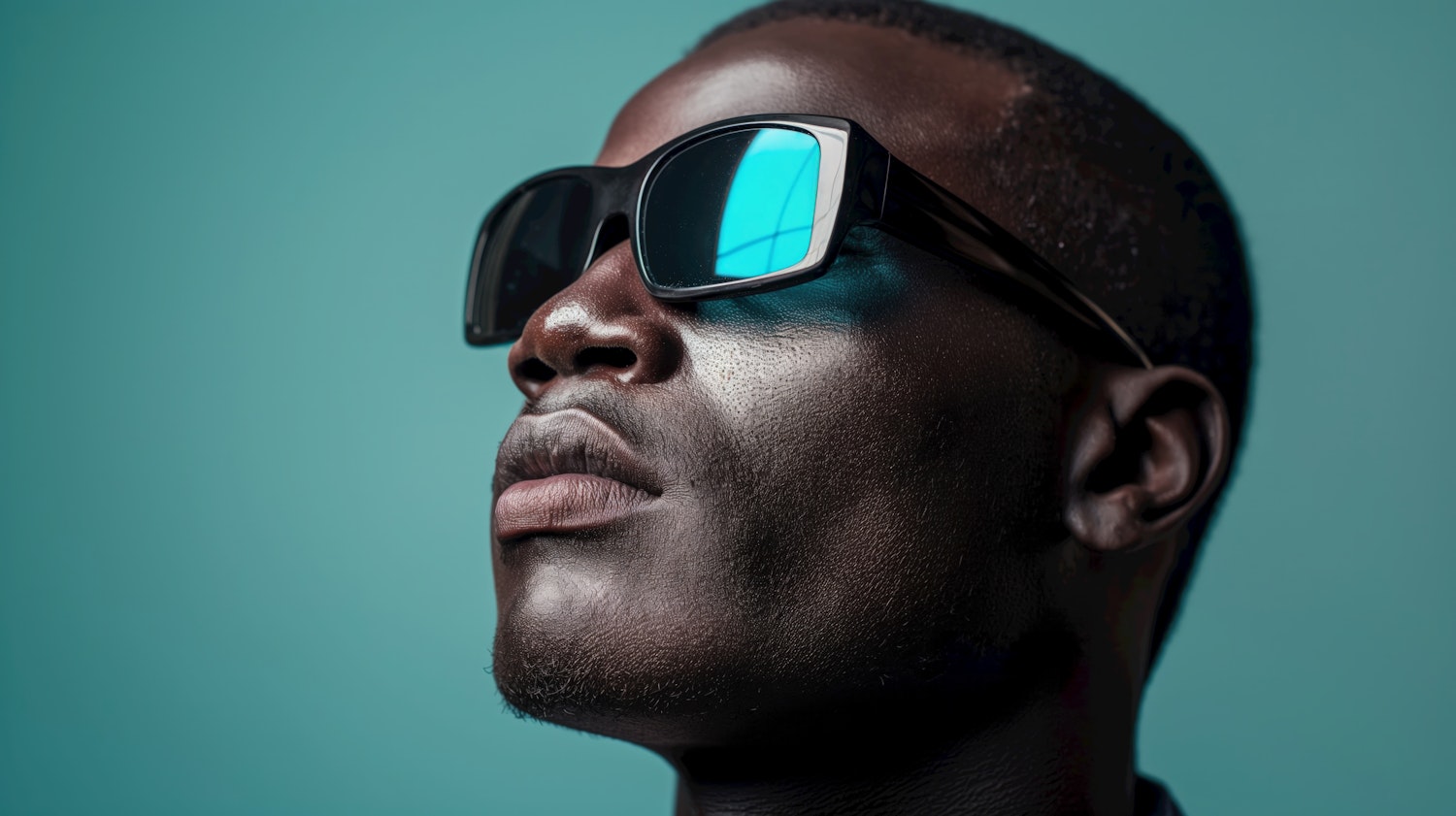 Close-up of a person with dark skin and short hair against a teal background, face obscured by blur.