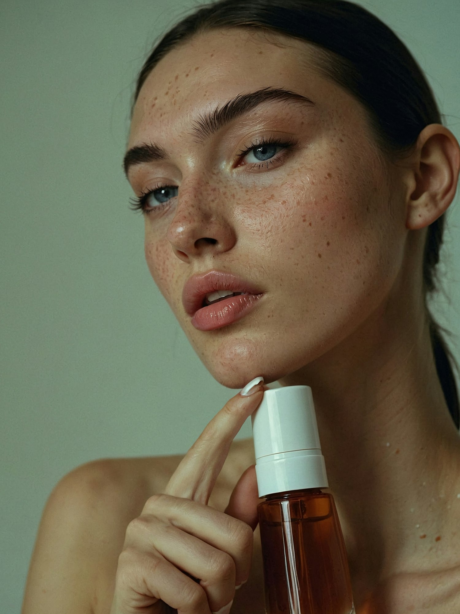 Light-skinned person holding a skincare bottle with brown liquid, emphasizing beauty and care in a soft green background.