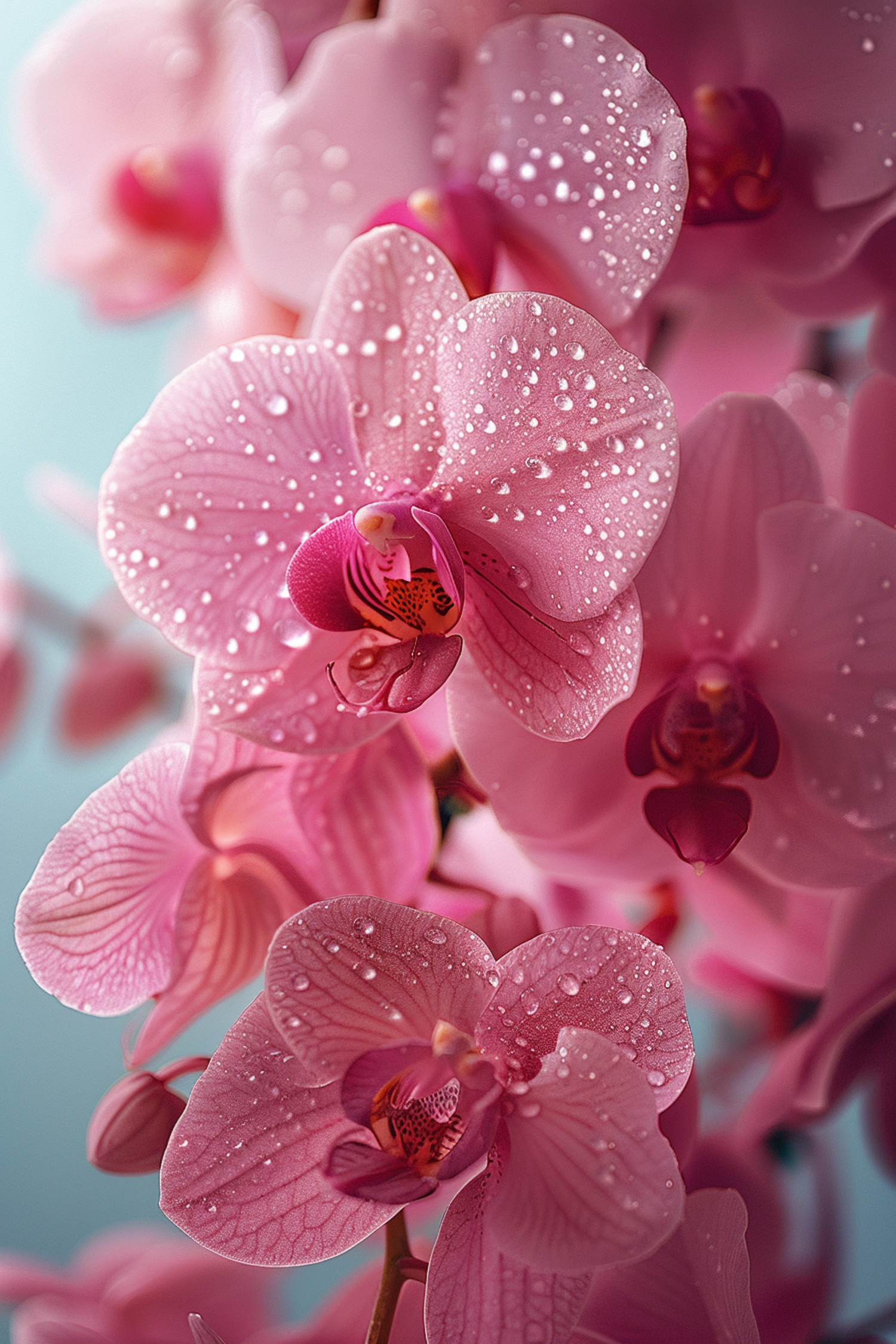 Vibrant pink orchids with water droplets on petals, set against a soft blue background, creating a fresh and elegant floral scene.