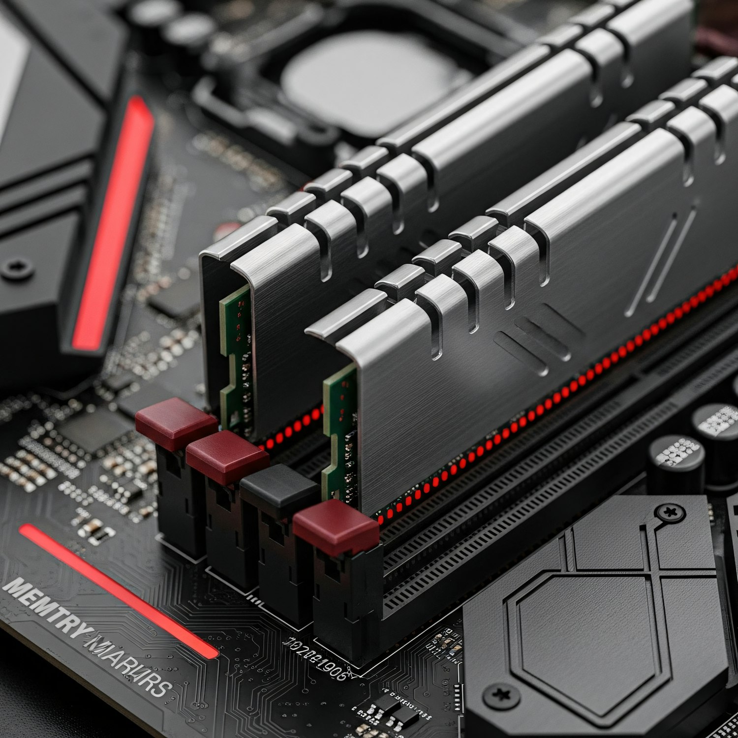 Close-up of a computer motherboard with two sleek RAM modules installed, featuring metallic heat spreaders and red accents.