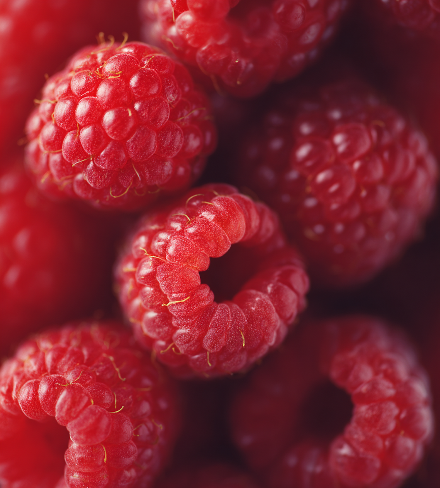 Close-up of fresh, vibrant red raspberries with detailed texture and natural sheen, perfect for food and nature enthusiasts.