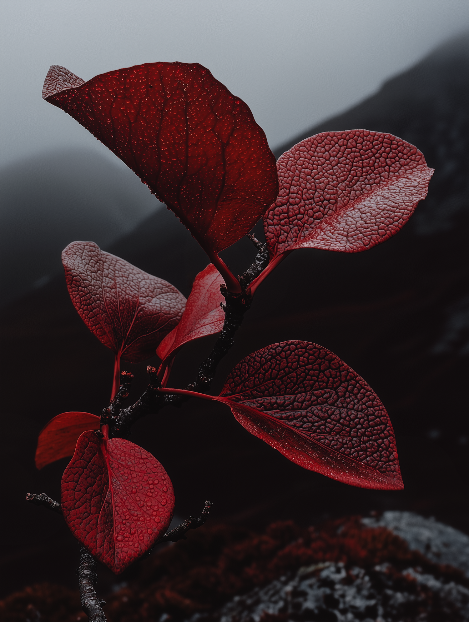 Close-up of vibrant red leaves with intricate veins against a misty gray background, creating a dramatic contrast.