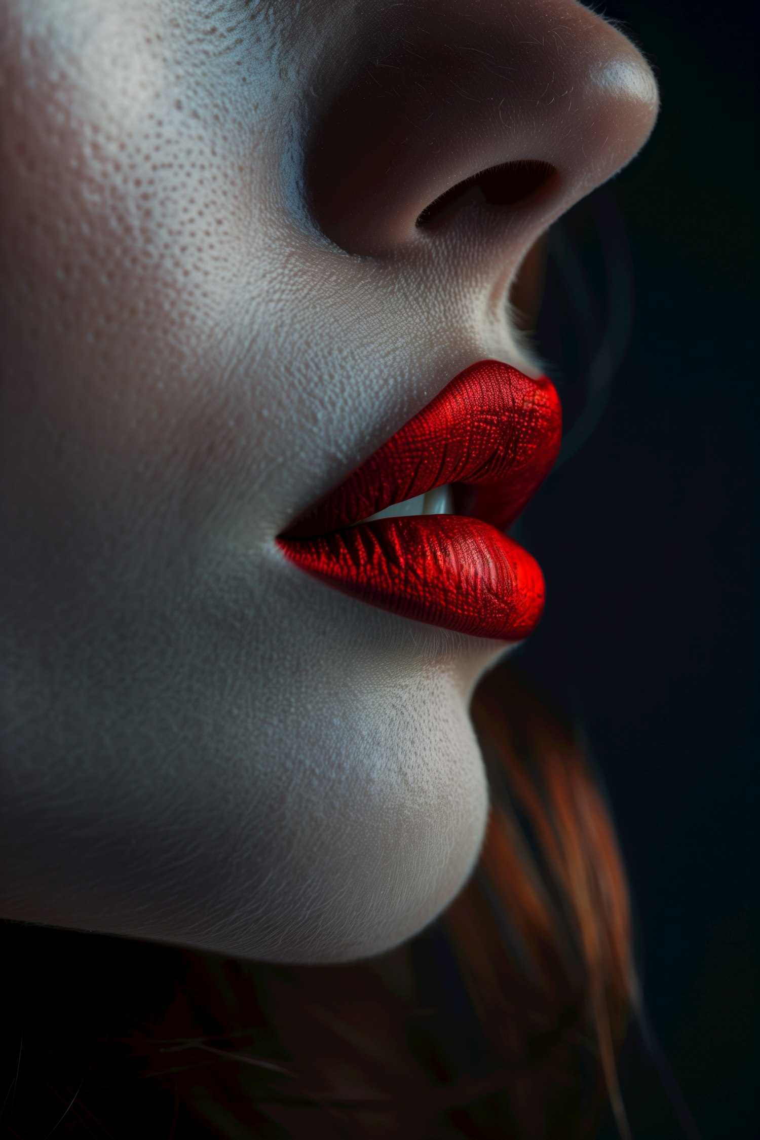 Close-up of vibrant red lips and pale skin, highlighting texture and contrast in dramatic lighting.