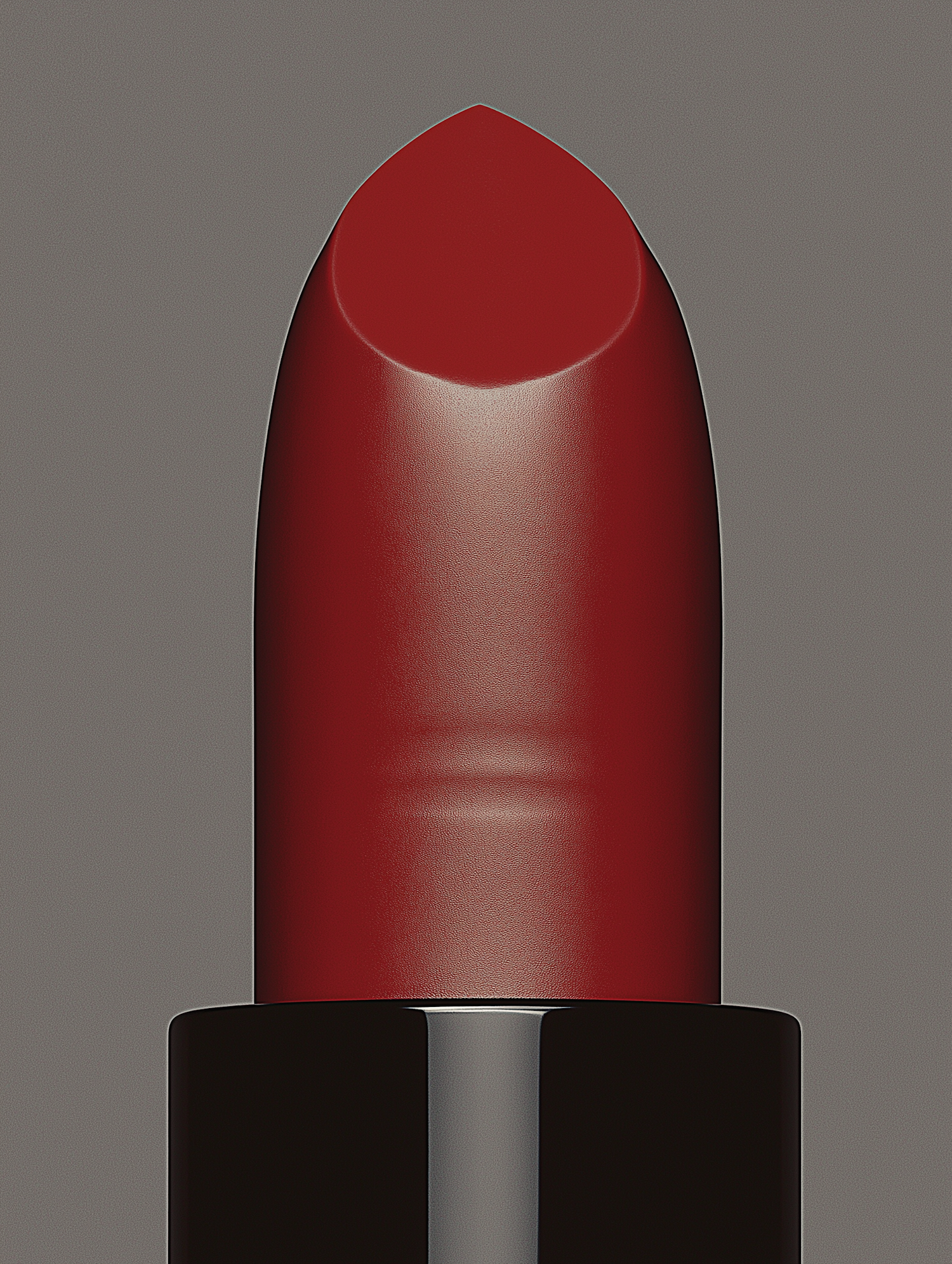 Close-up of a deep red lipstick with a glossy finish against a muted gray background, highlighting its luxurious texture.