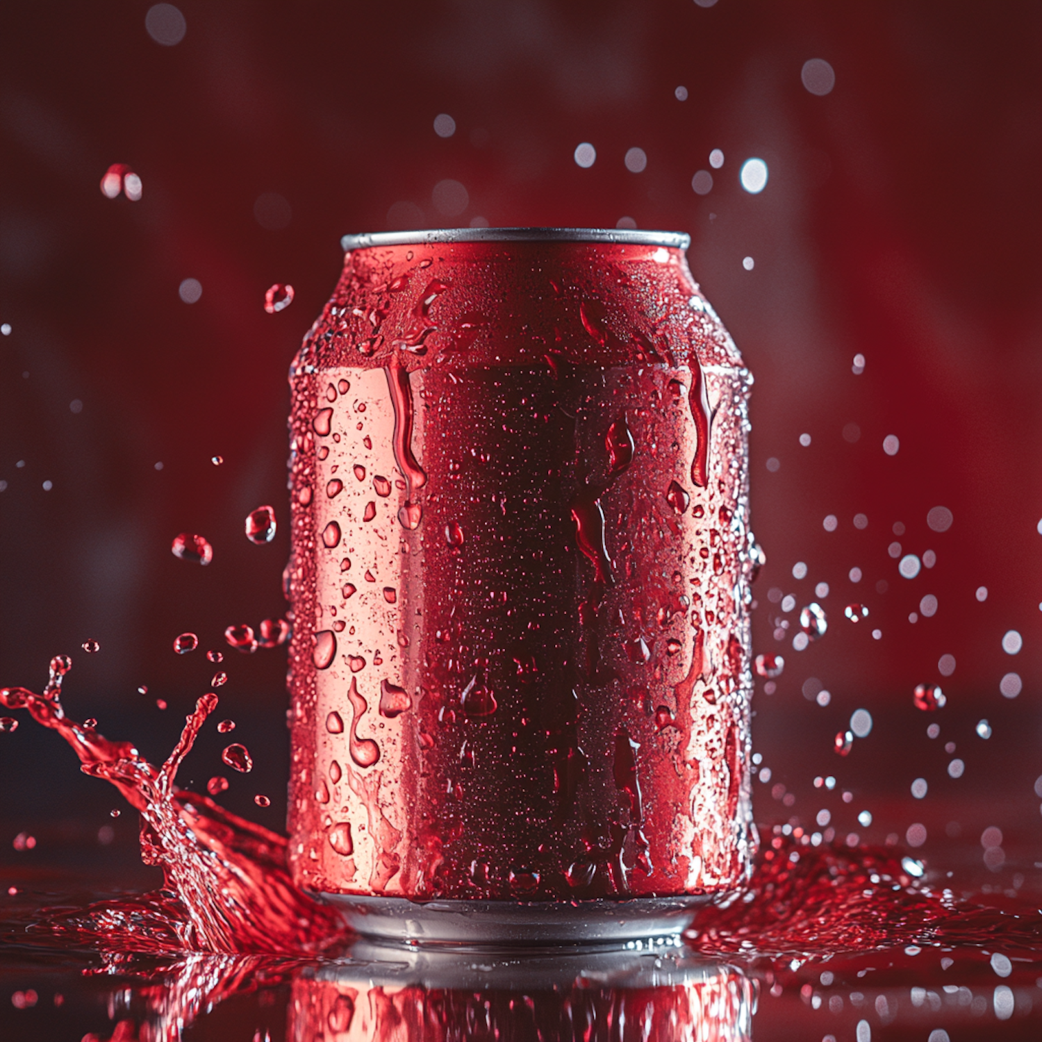 Refreshing red soda can with water droplets and splashes, set against a vibrant red background, conveying freshness and energy.
