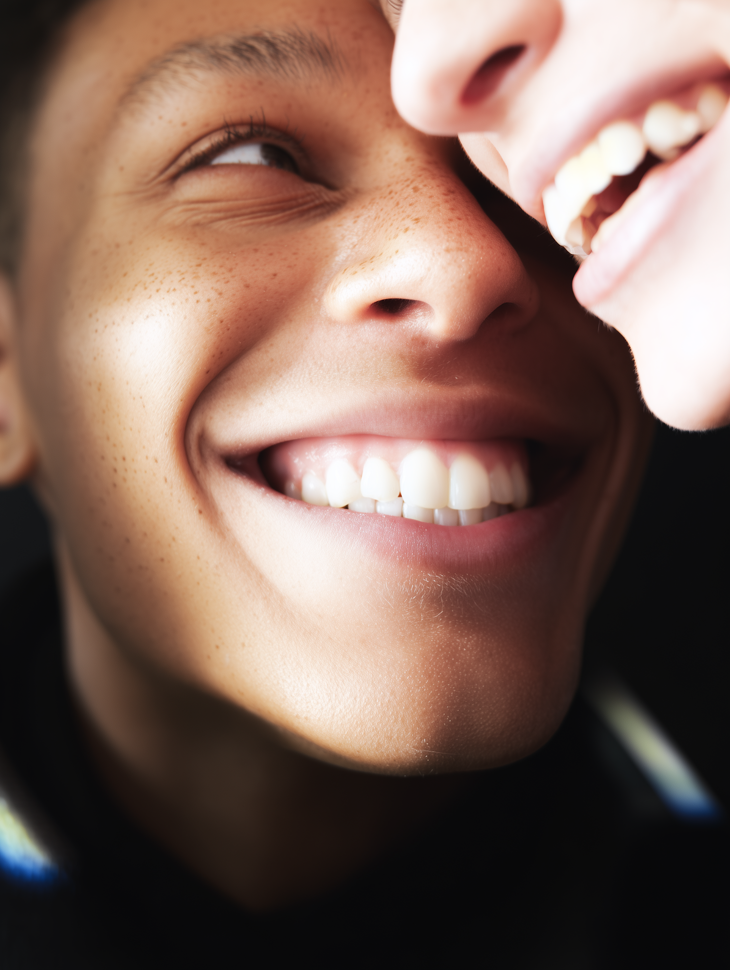 Close-up of the joyful smiles of two individuals, with one prominently showing freckles and vibrant expressions.