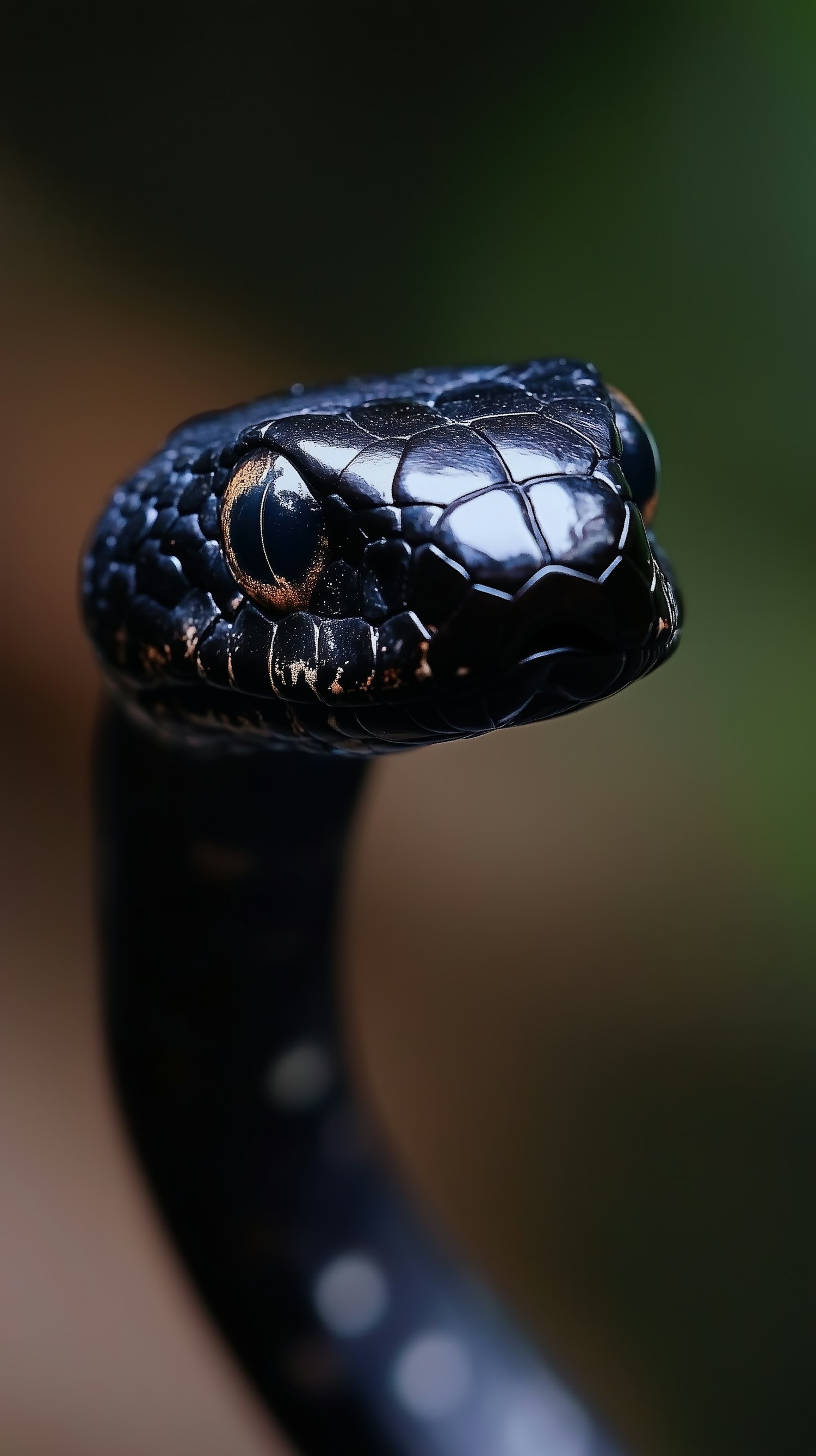Close-up of a glossy black snake's head with reflective scales and intense eyes, set against a blurred background.