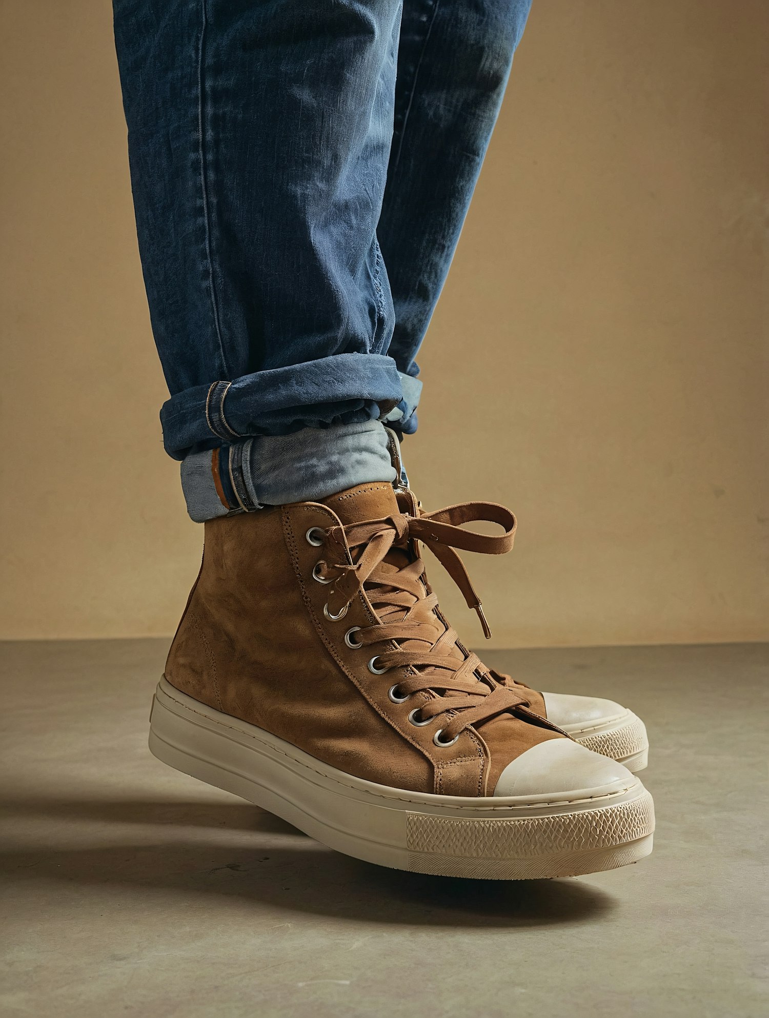 Stylish brown high-top sneakers with white soles paired with rolled-up blue jeans on a neutral background.