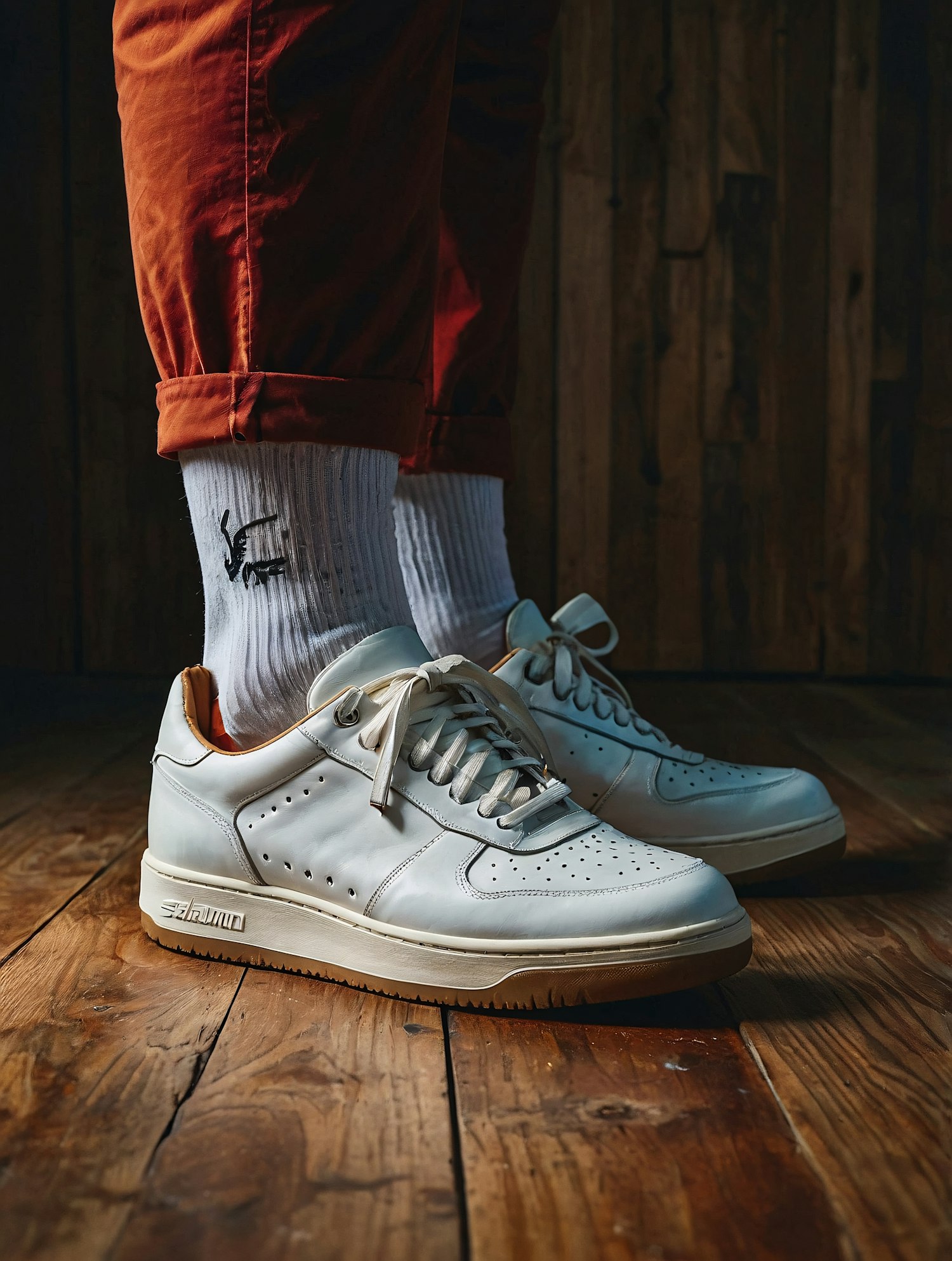 Stylish white sneakers with beige soles and rust-colored pants on a rustic wooden floor, creating a trendy and casual look.