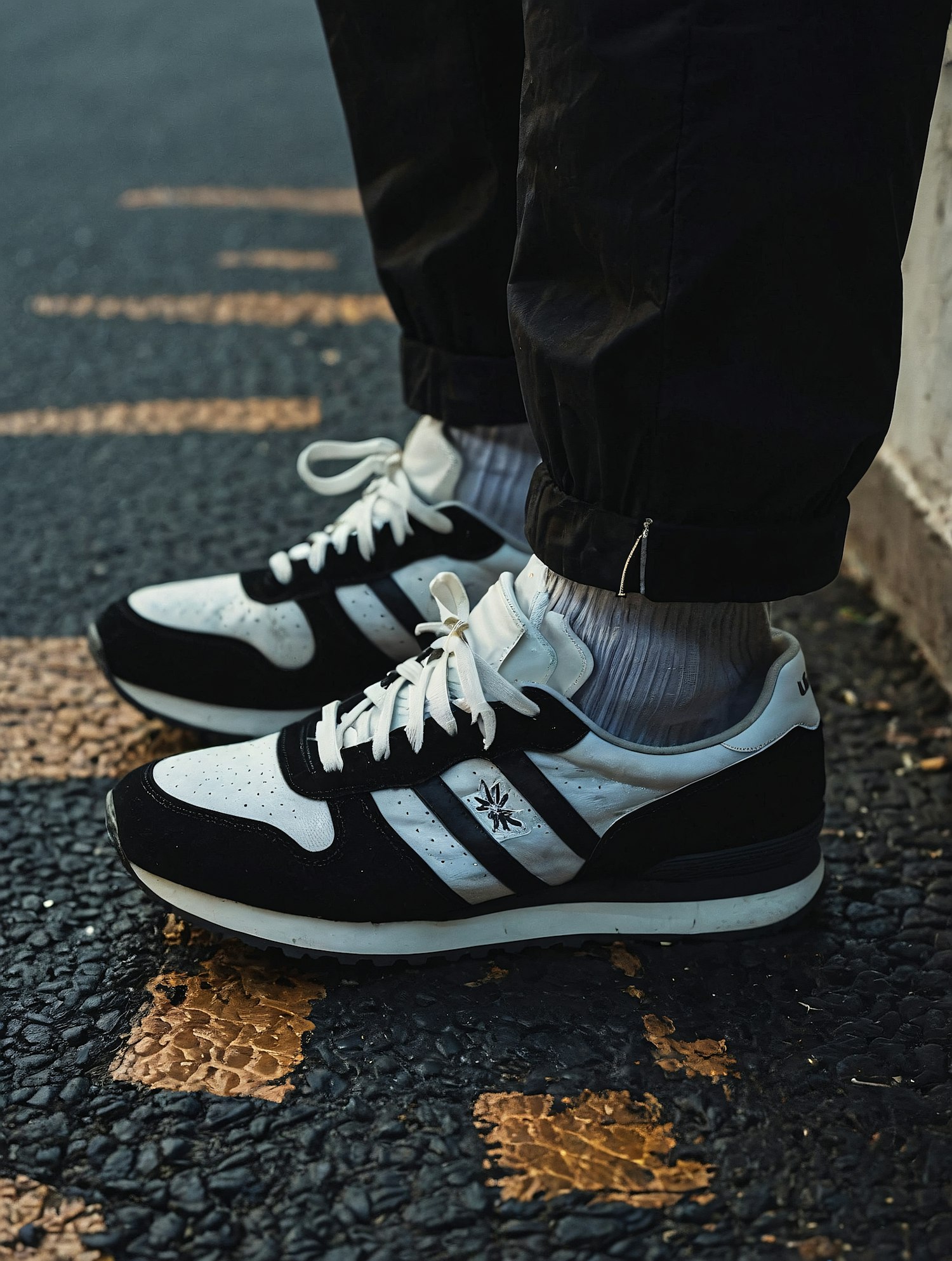 Stylish black and white sneakers with a unique logo, worn with black pants and white socks on an urban asphalt background.