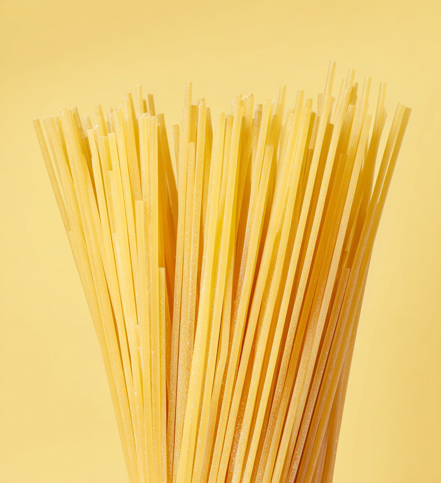 A bundle of uncooked spaghetti pasta against a yellow background, showcasing its golden color and texture in a minimalist style.