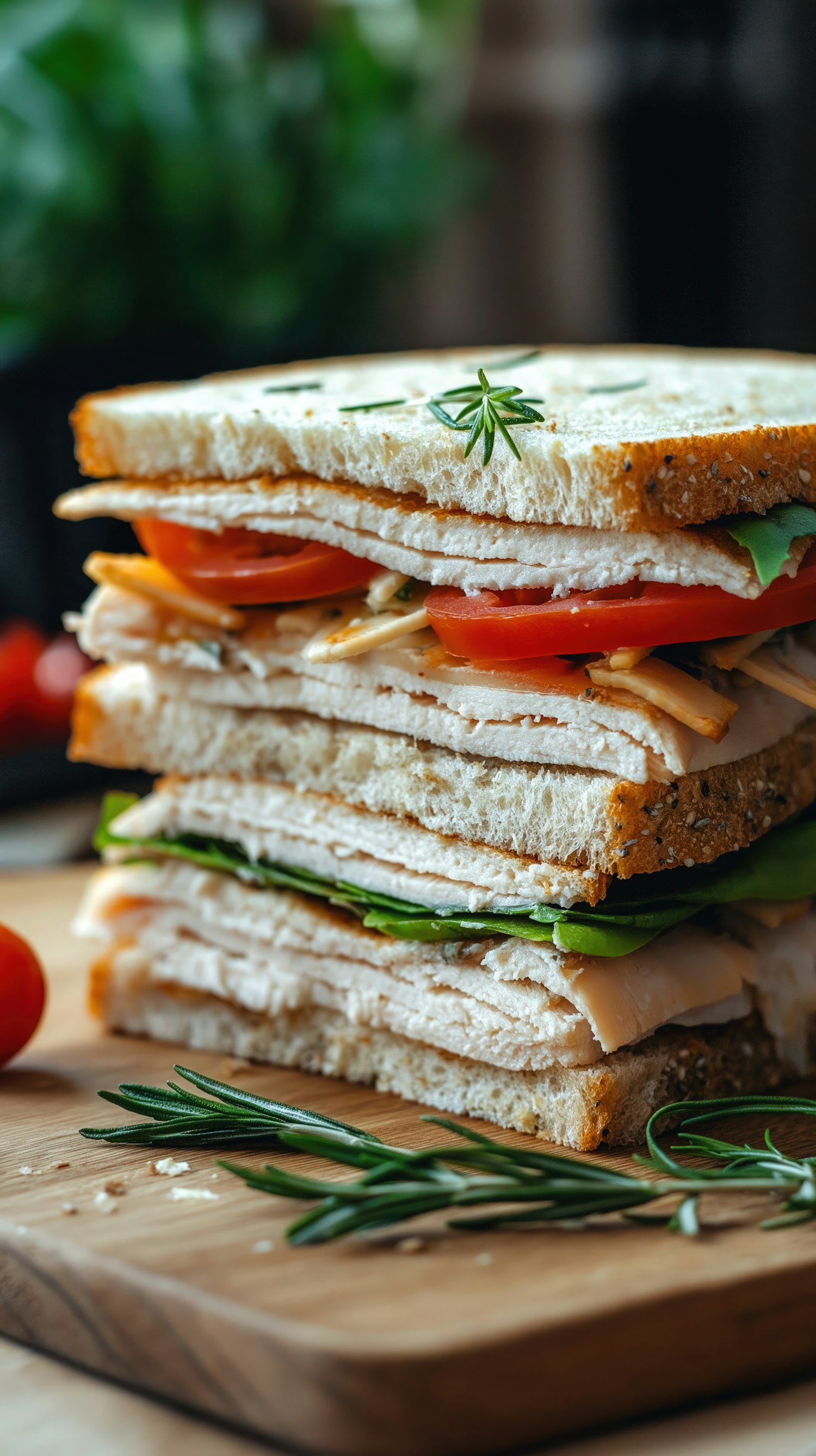 Delicious stacked sandwich with turkey, tomatoes, and greens on a wooden board, garnished with rosemary.