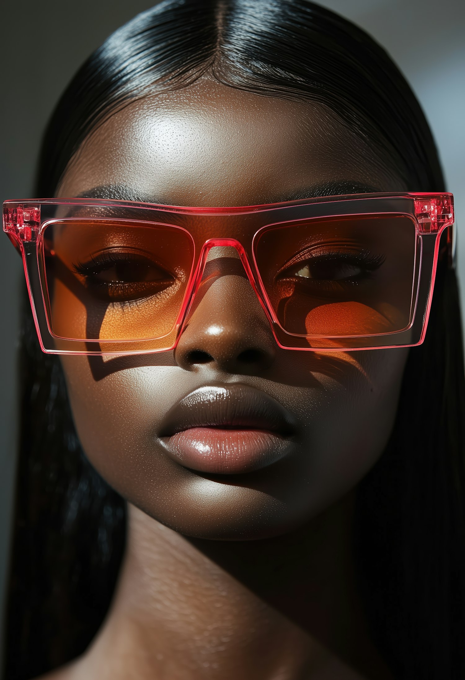 Close-up of a woman with dark skin wearing pink sunglasses, glossy lips, and sleek hair, exuding confidence and style.