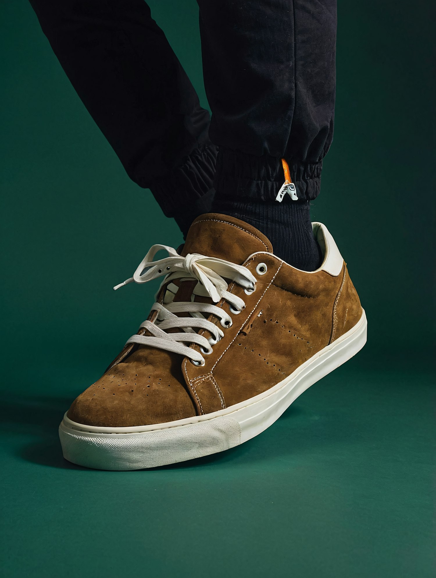 Stylish brown suede sneaker with white laces and rubber sole, paired with black pants. Elegant design against a dark green background.