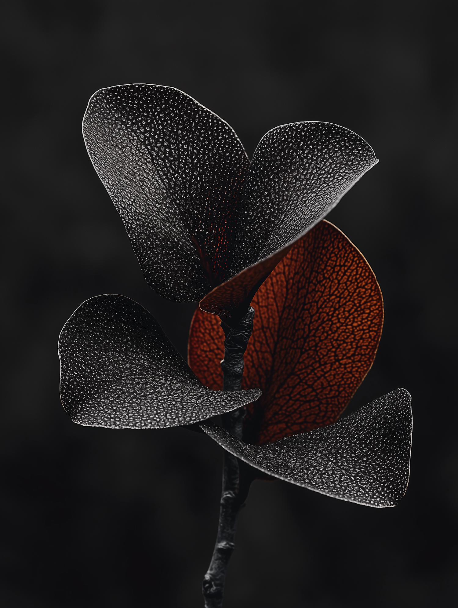 Close-up of textured plant leaves with dark speckles and a striking red leaf against a black background.