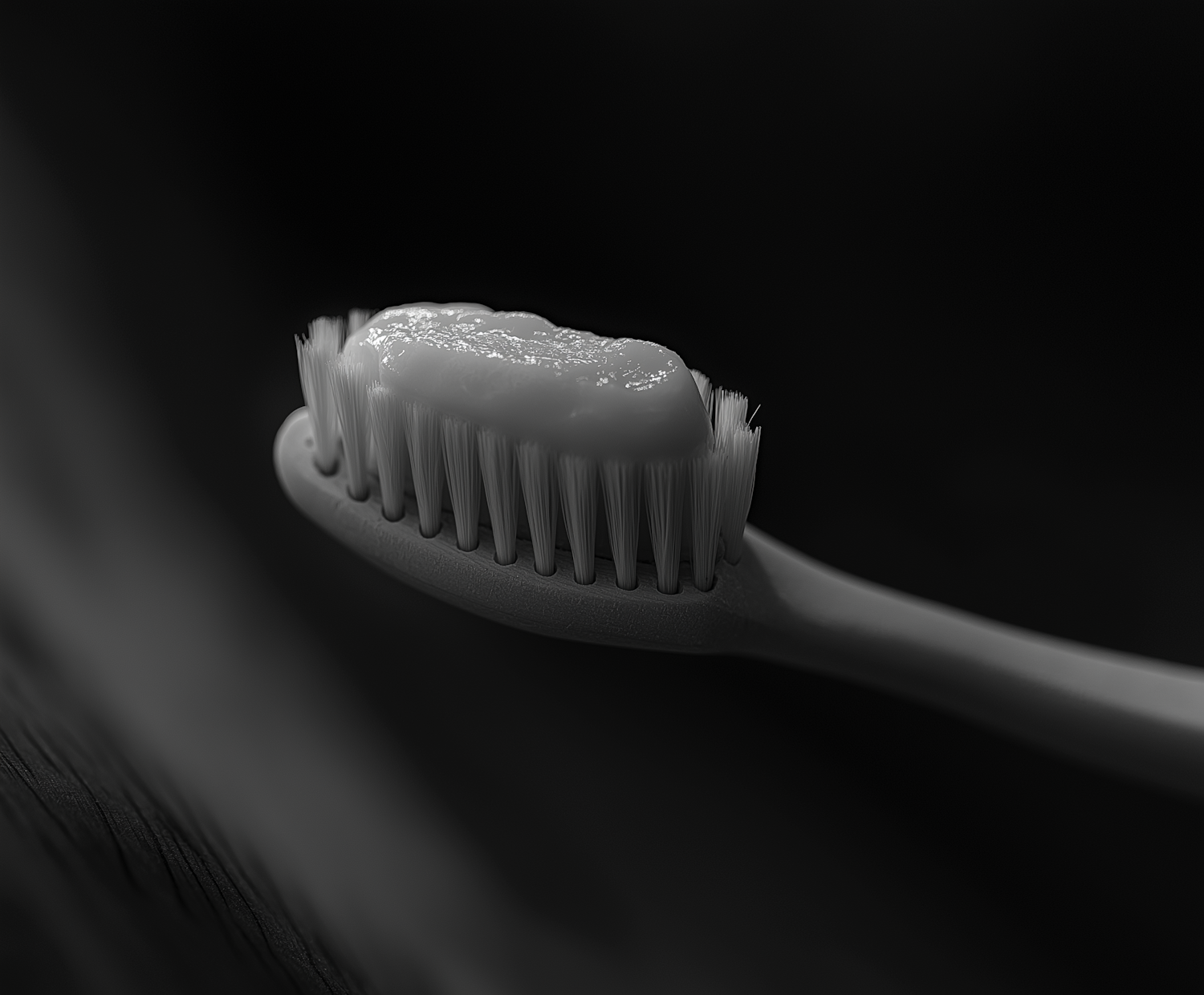 Close-up of a toothbrush with toothpaste, featuring detailed bristles and a sleek monochromatic design.