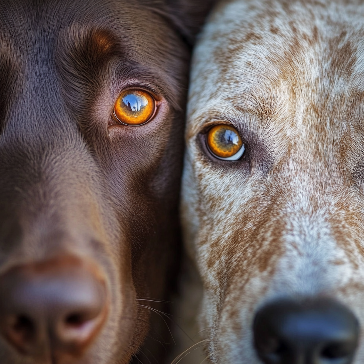 Close-up of two dogs with striking amber eyes, one chocolate brown and the other speckled. Their eyes reflect a person and landscape.