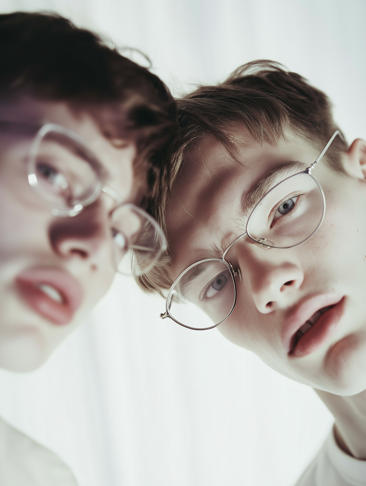 Two young men with glasses and light brown hair, one in focus with blue eyes, creating a soft, ethereal atmosphere.