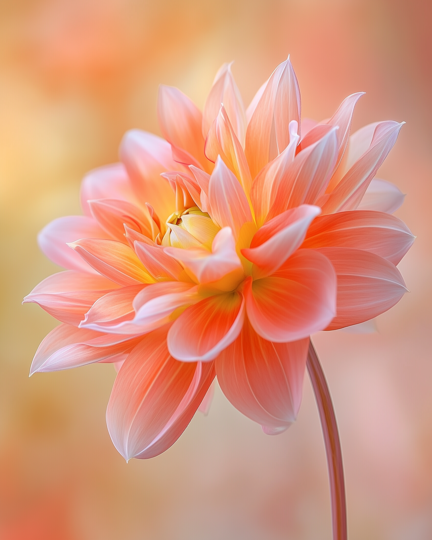Close-up of a vibrant peach and pink dahlia with soft, layered petals against a blurred orange-yellow background.