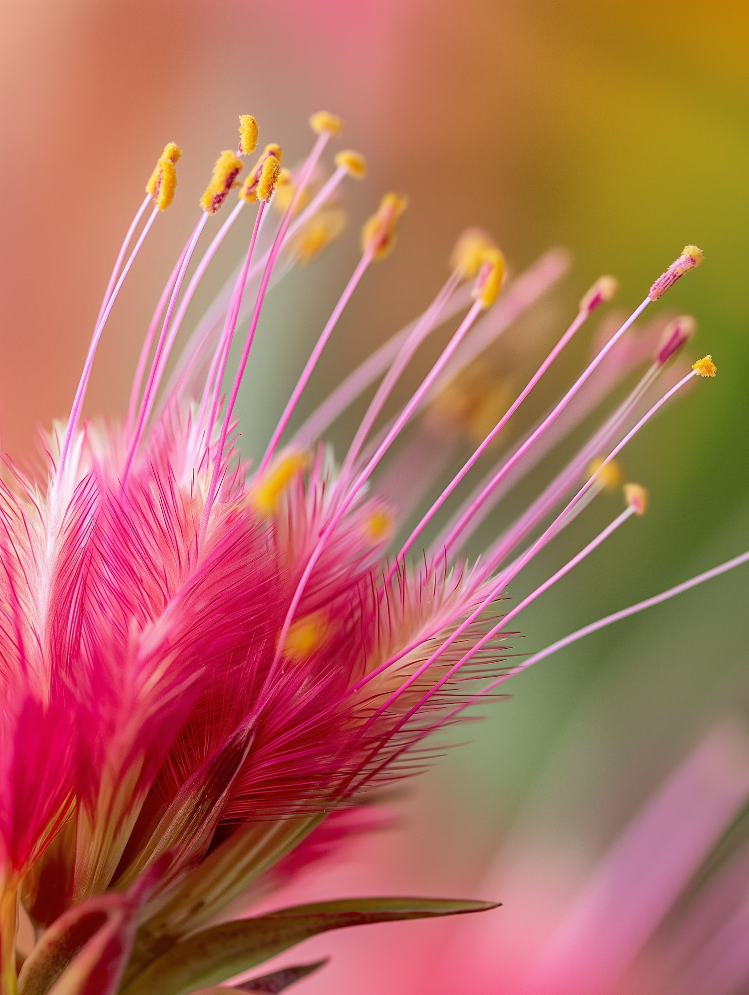 Close-up of a vibrant pink flower with feathery petals and yellow-tipped stamens against a blurred green and orange background.