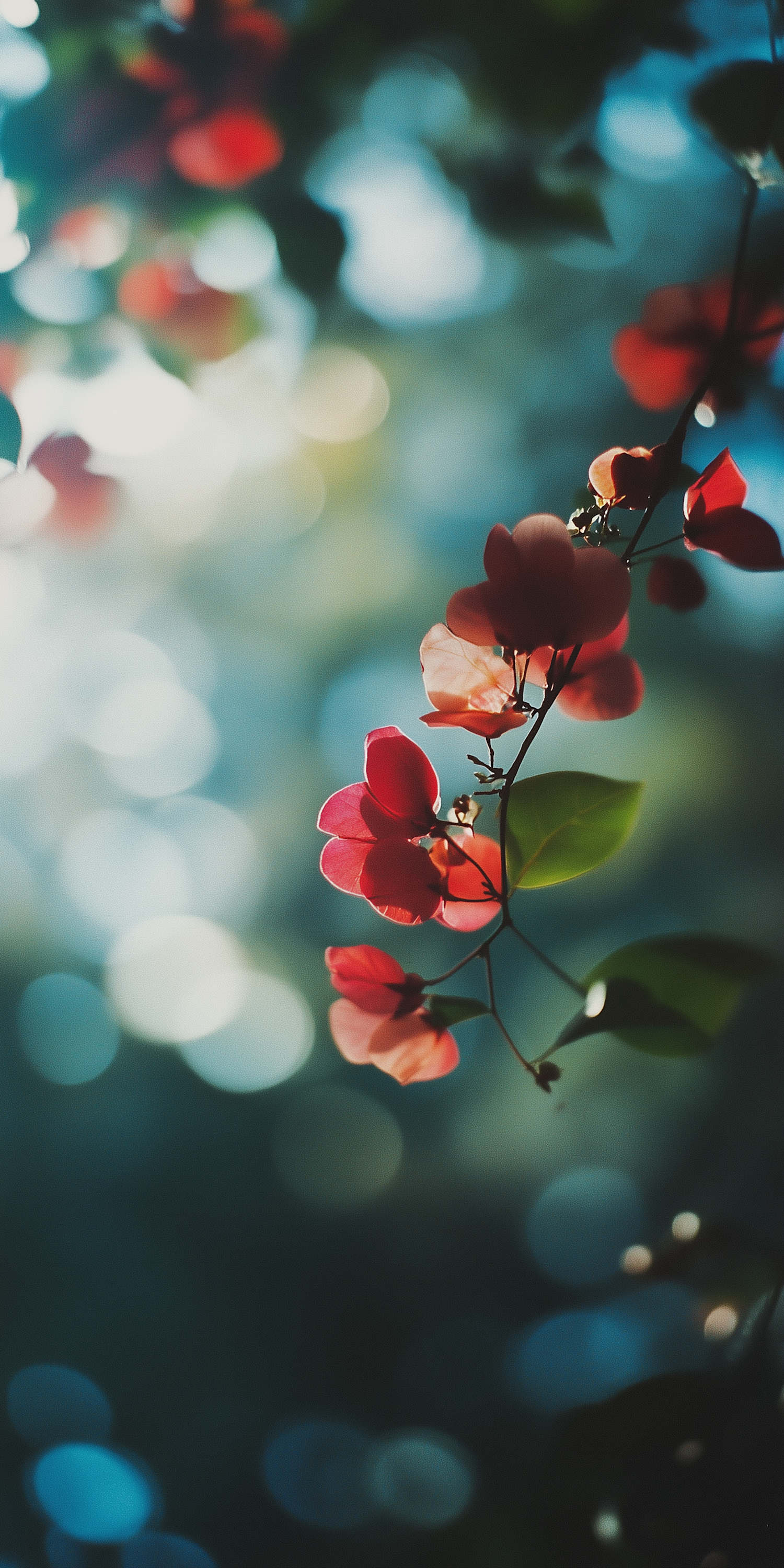 Vibrant red flowers with green leaves against a dreamy bokeh background, creating a serene and harmonious nature scene.