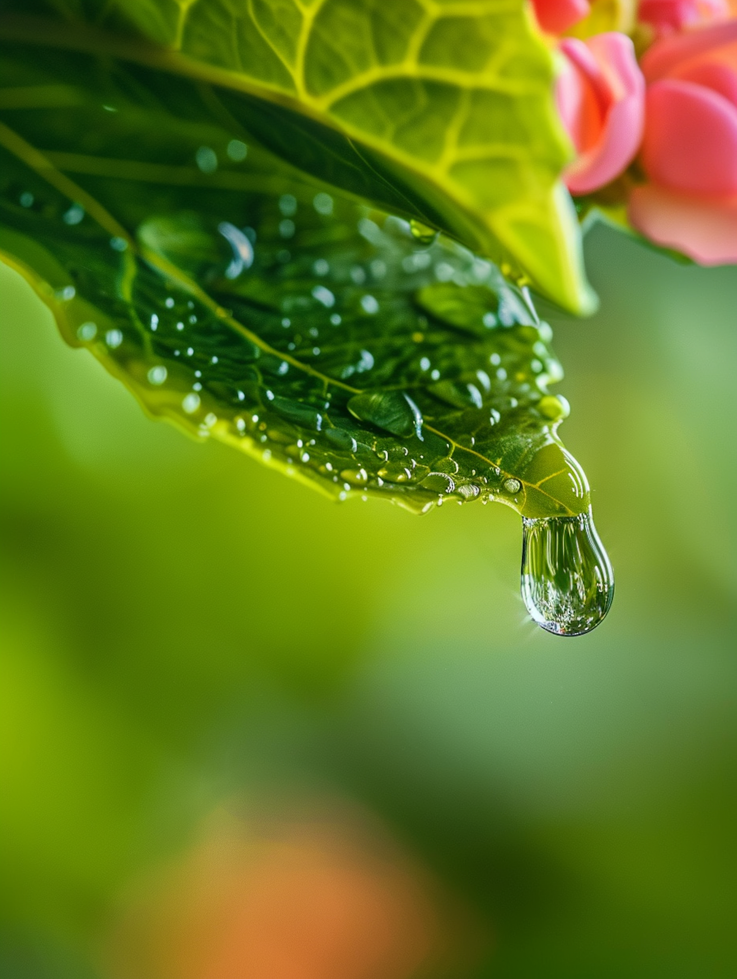 Close-up of a green leaf with water droplets and a hanging droplet, set against a blurred green and pink background.