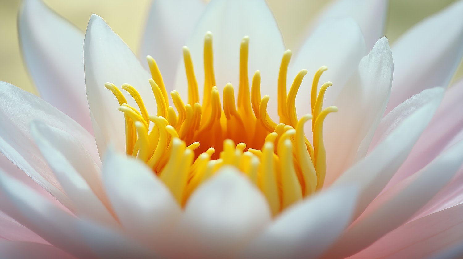 Close-up of a water lily with white petals and vibrant yellow stamens, showcasing delicate textures and soft lighting.