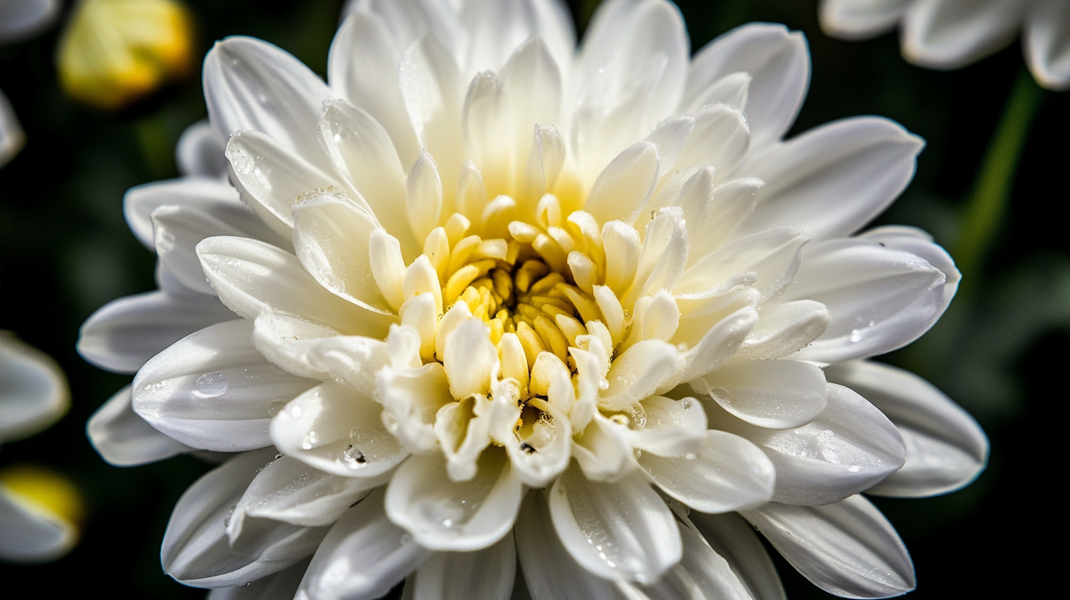 Close-up of a white chrysanthemum with dewy petals and a vibrant yellow center, showcasing intricate details and natural beauty.