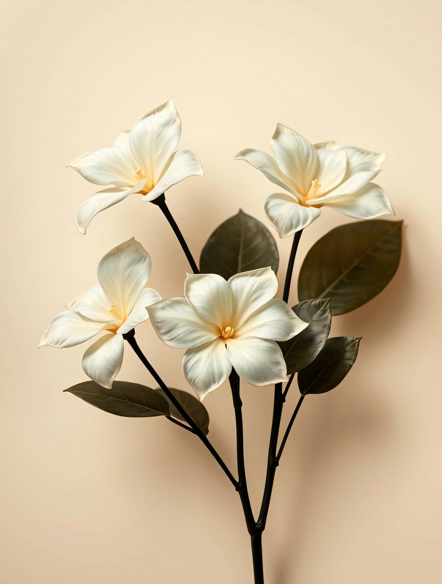 Elegant white flowers with green leaves on a beige background, showcasing a minimalist and natural aesthetic.