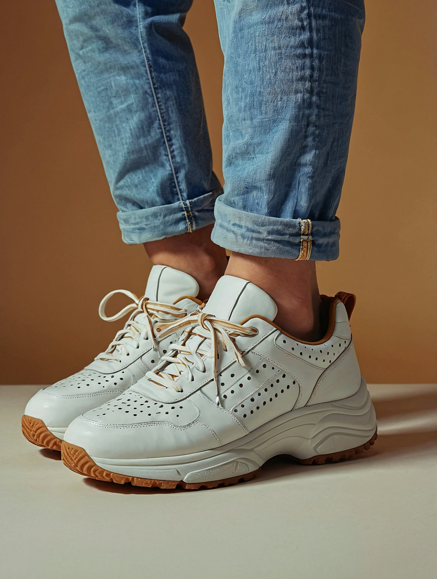 Stylish white sneakers with brown soles and laces paired with rolled-up light blue jeans on a neutral background.