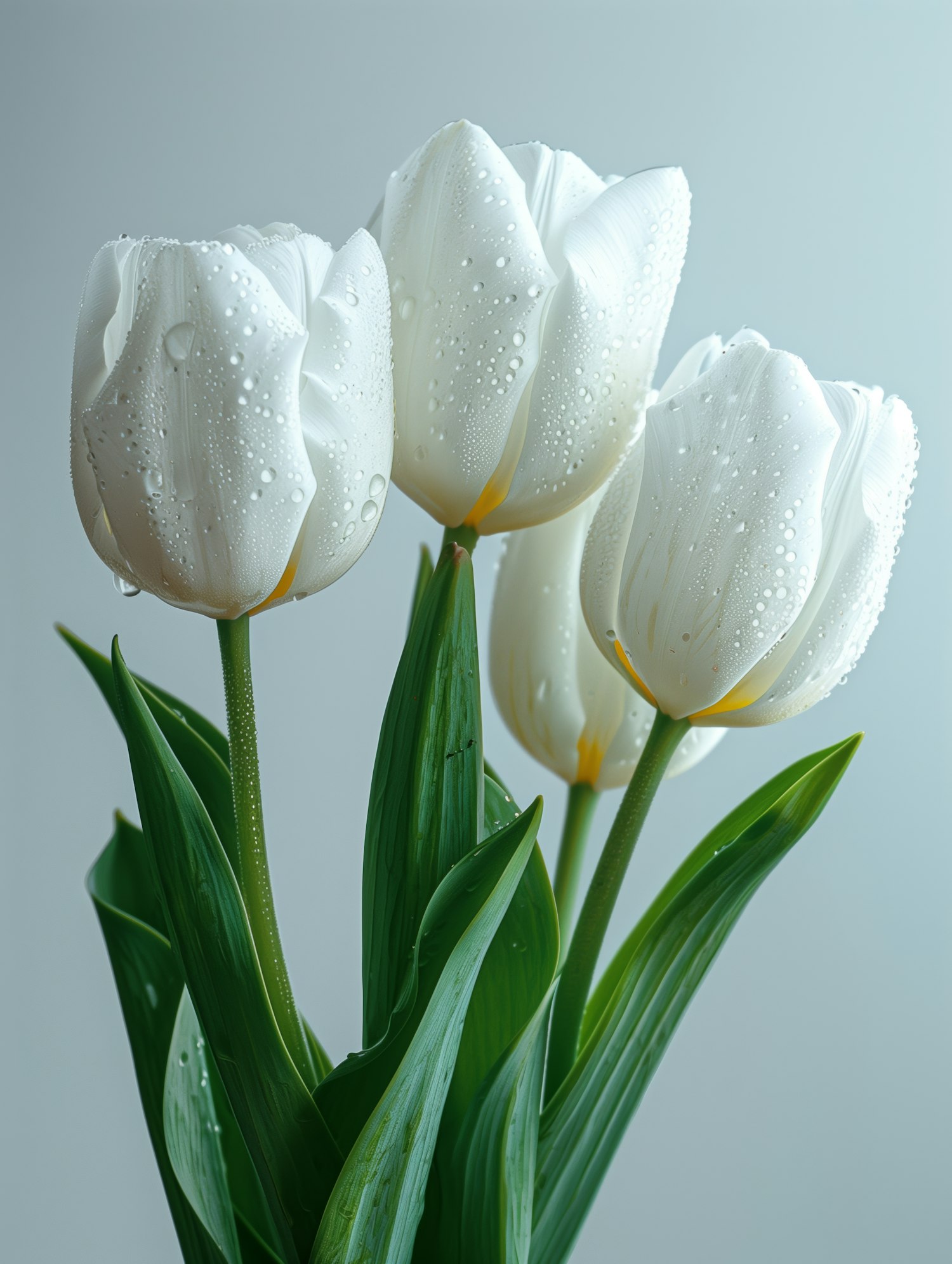 Elegant white tulips with water droplets, set against a soft background, showcasing their fresh and serene beauty.