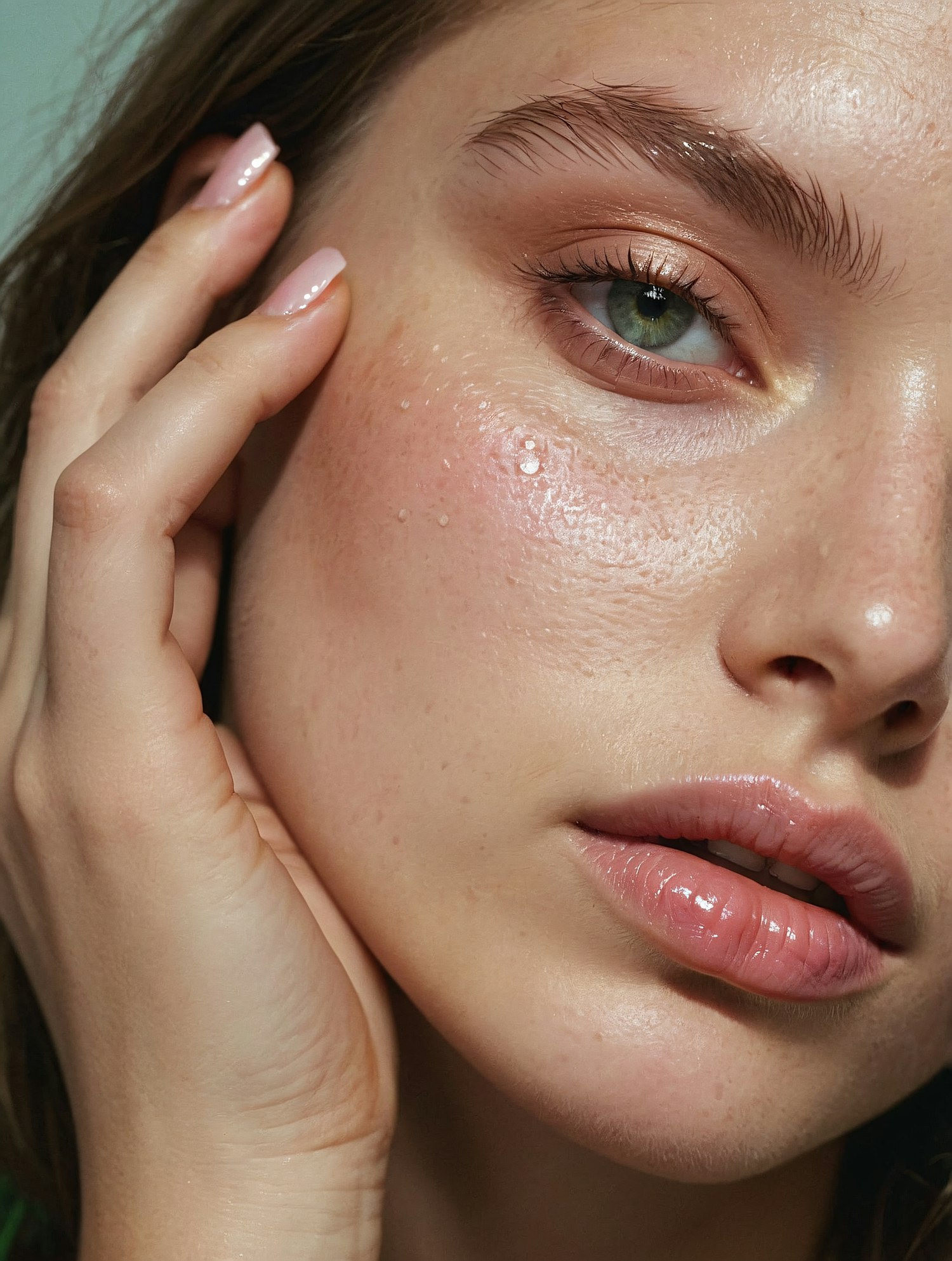 Close-up of a woman's dewy skin, green eye, glossy pink lips, and manicured nails, showcasing natural beauty and skincare.