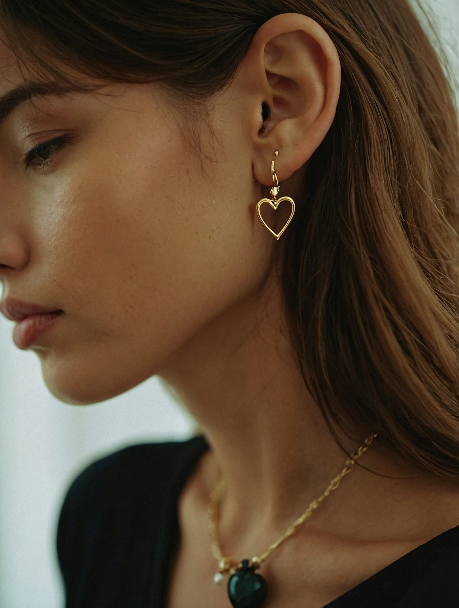 Close-up of a woman wearing gold heart-shaped earrings and a necklace with a black heart pendant, showcasing elegant jewelry.