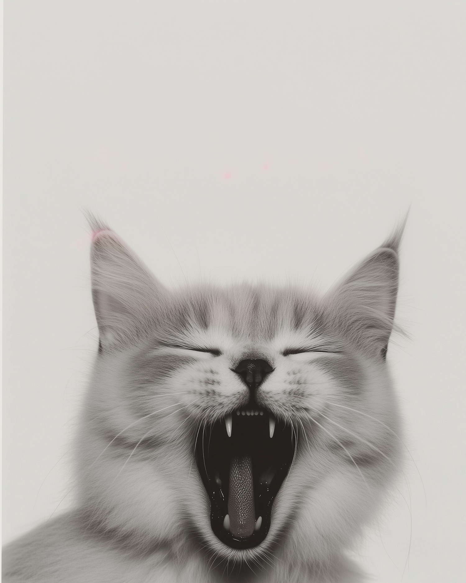 Close-up of a fluffy gray cat yawning, showing sharp teeth and a pink tongue against a plain background.