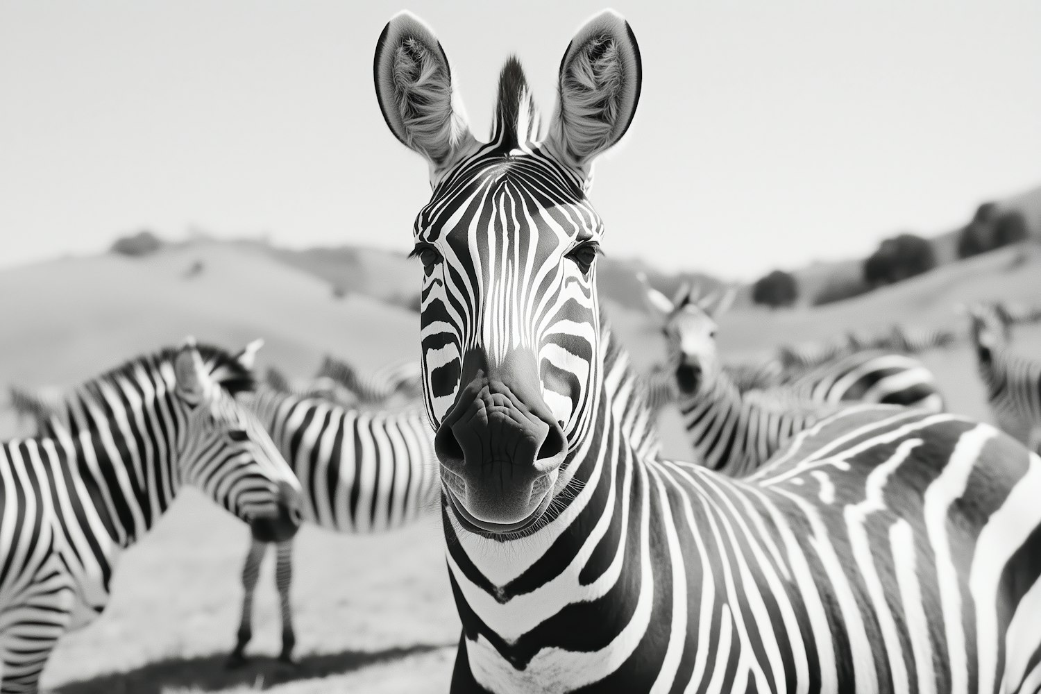 Close-up of a zebra in a herd, showcasing its striking black and white stripes in a serene grassy landscape.