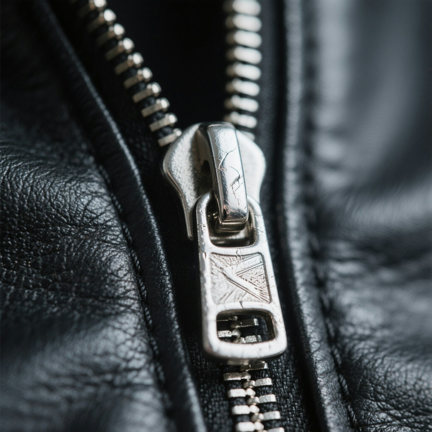 Dynamic editorial extreme close-up of a metallic zipper pull on a leather jacket.