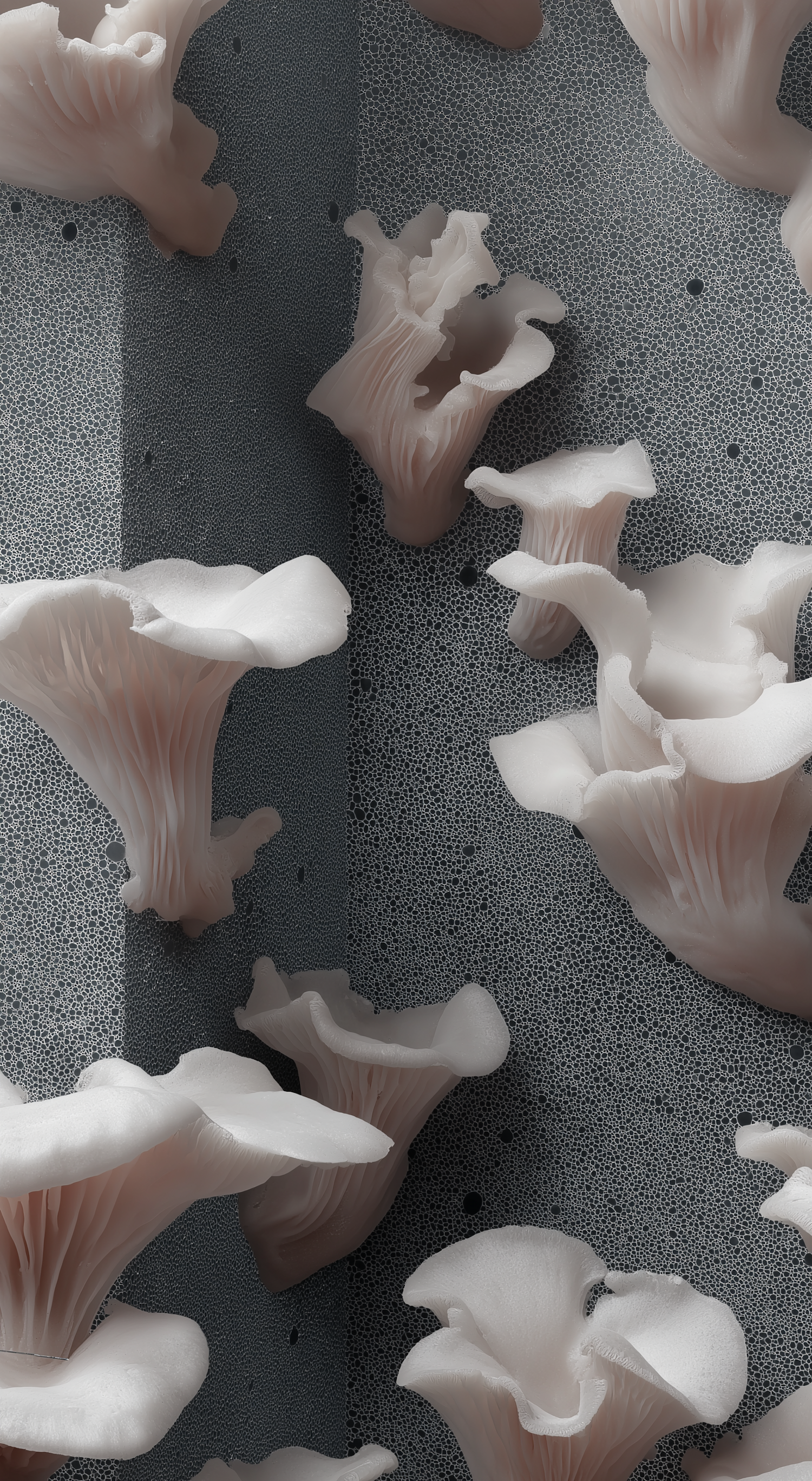 Close-up of oyster mushrooms growing on a dark speckled surface, showcasing their soft, wavy caps and intricate textures.