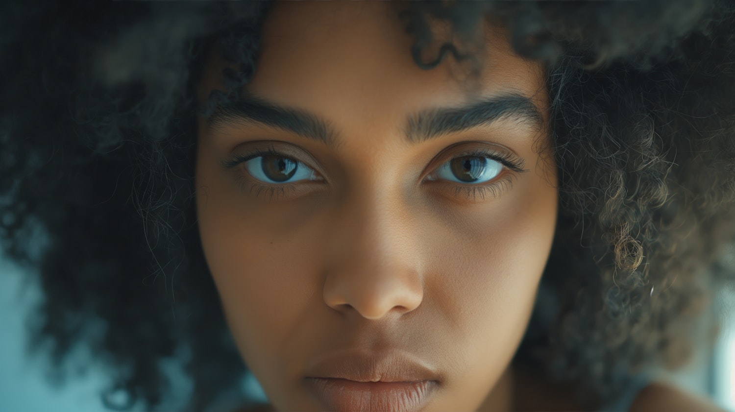 Close-up portrait of a young woman with curly hair and brown eyes, gazing intently. Soft lighting highlights her natural beauty.