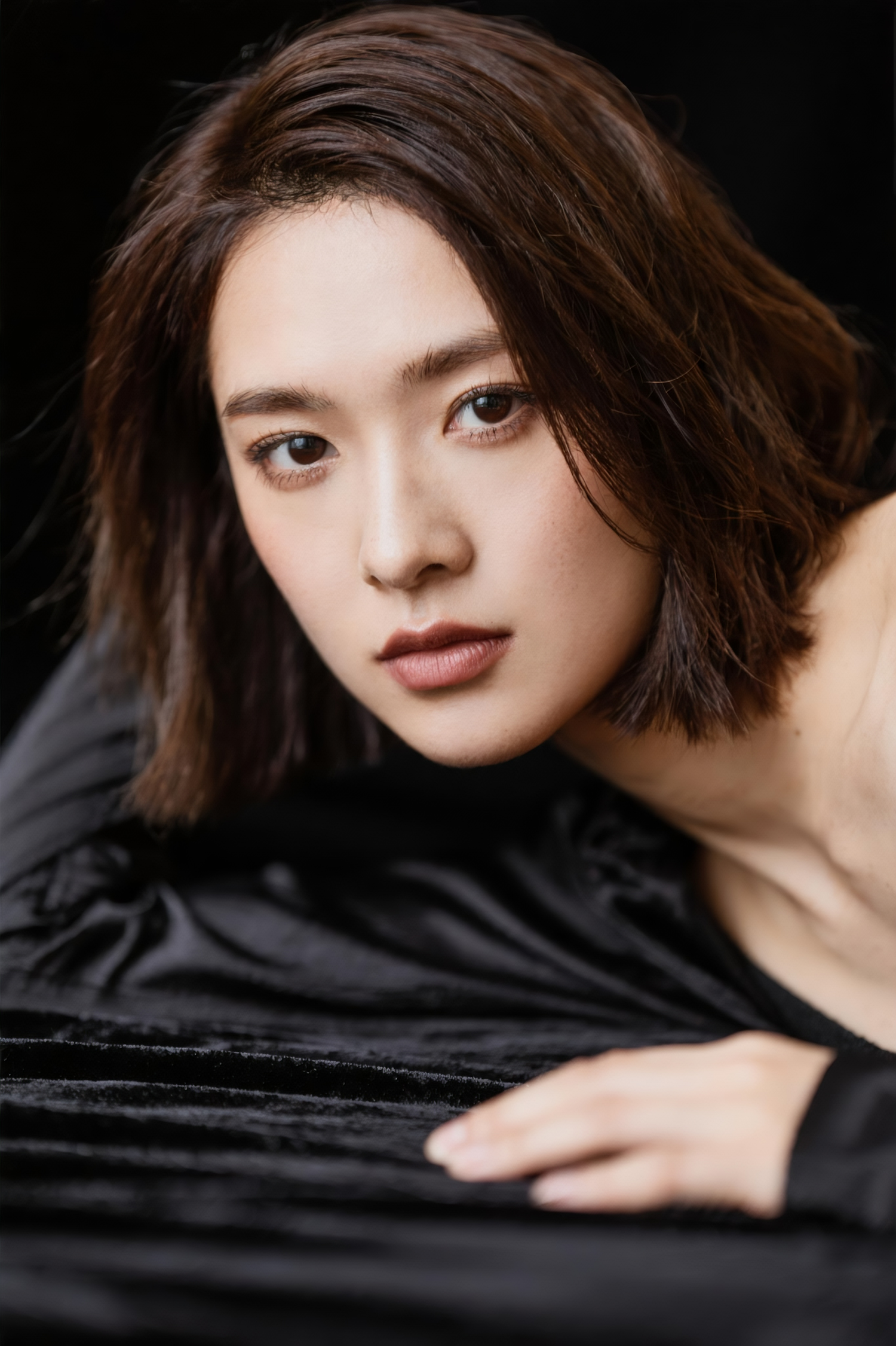 Close-up portrait of a person with short dark hair, resting on a black surface, with a neutral expression and direct gaze.