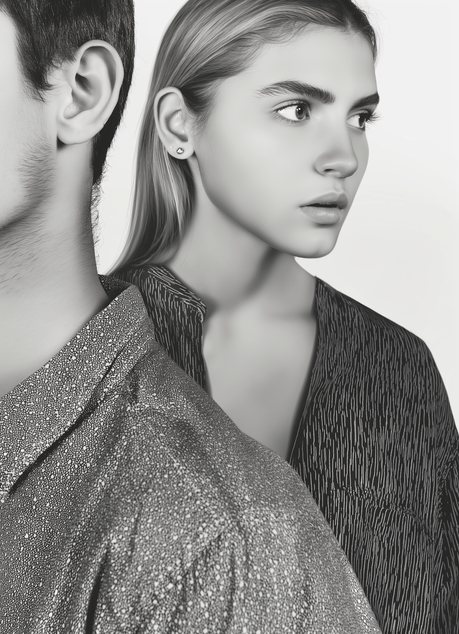 Close-up of two individuals in textured shirts, one gazing sideways with striking eyebrows and blonde hair, the other partially visible.