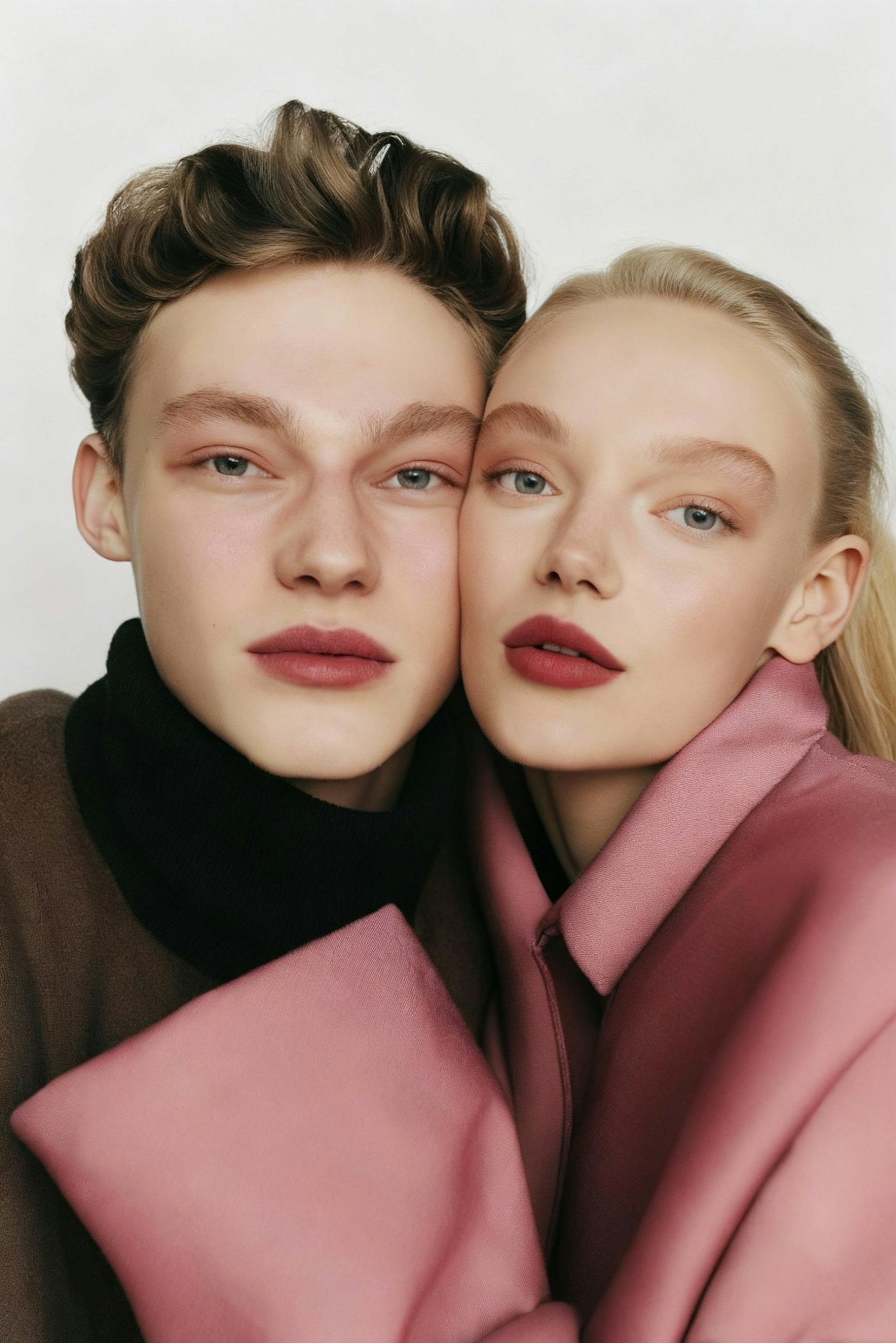 Close-up of a man and woman with light features, wearing stylish coats, against a plain white background.